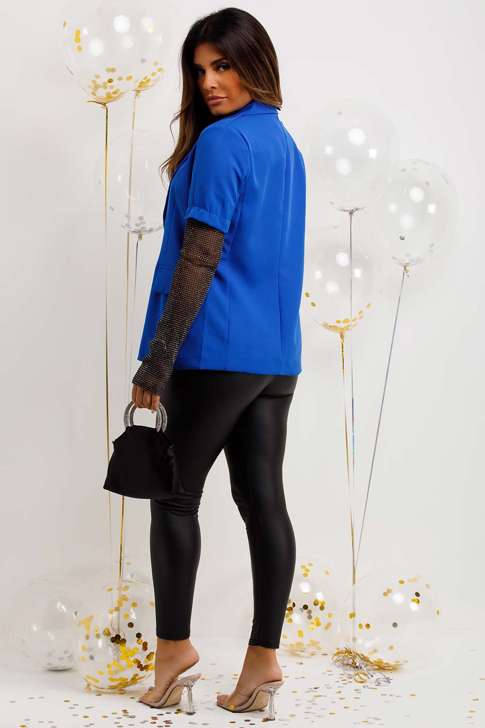 Blazer with diamante net sleeve. This blazer jacket is going to take your look to the next level effortlessly. Featuring blazer jacket with diamante net chainmail sleeve detail. Style this diamante sleeve blazer with our leather look leggings to complete the outstanding looks. This blazer jacket is also available in other colours.