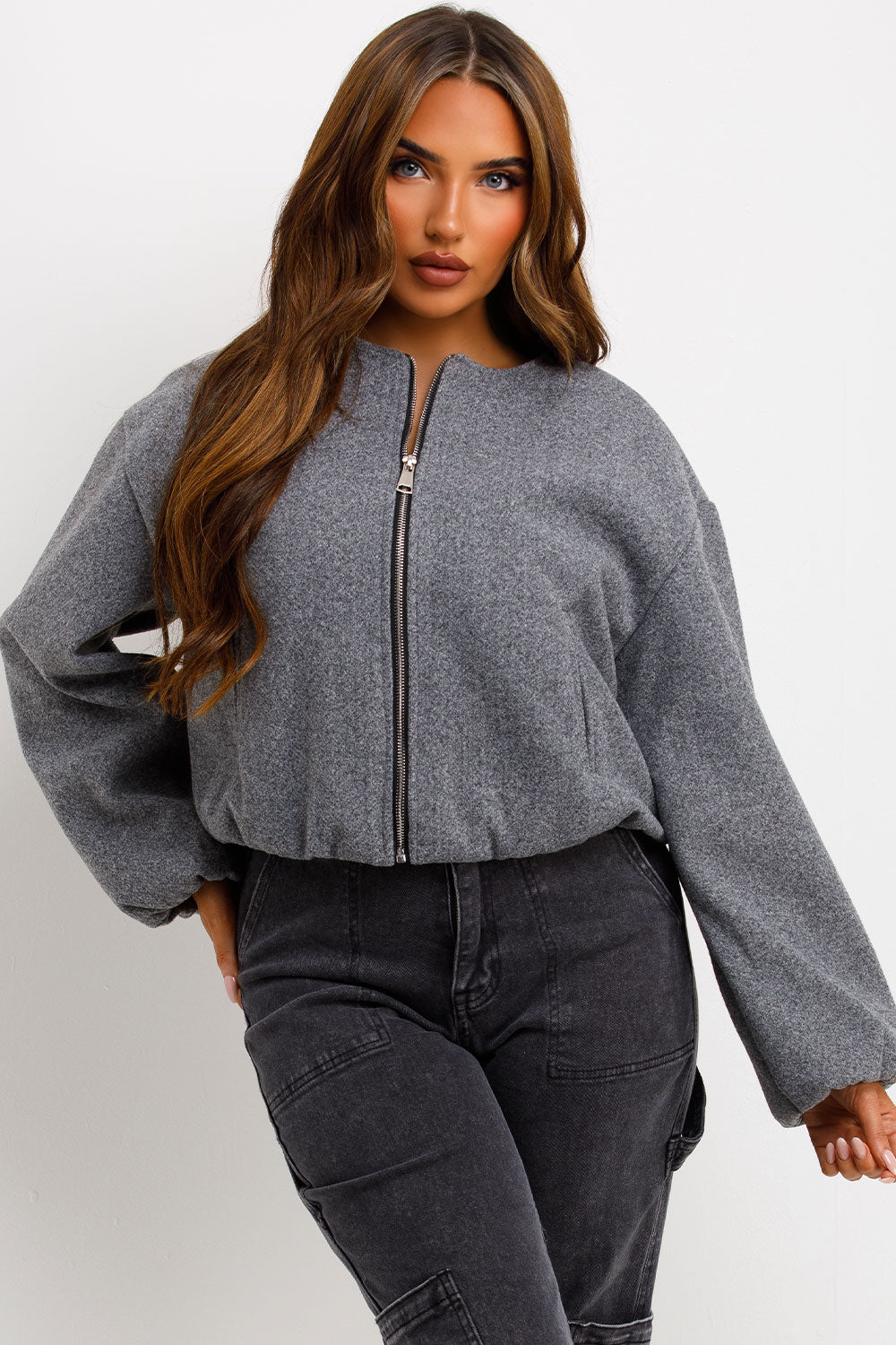 Soft bomber jacket. This bomber jacket is a must have for your new season outerwear wardrobe. Featuring soft bomber jacket with round neck elastic cuffs long sleeves pockets on front elasticated hem and zip up front. Style this bomber jacket with any outfit to complete the look we are loving. This soft bomber jacket is also available in other colours.