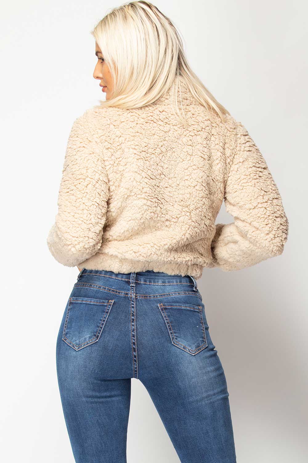 This crop teddy jumper is a must have for this new season. Featuring soft teddy bear faux fur, zip front, pockets and cropped length. Style it with a t shirt and jeans to complete the look.