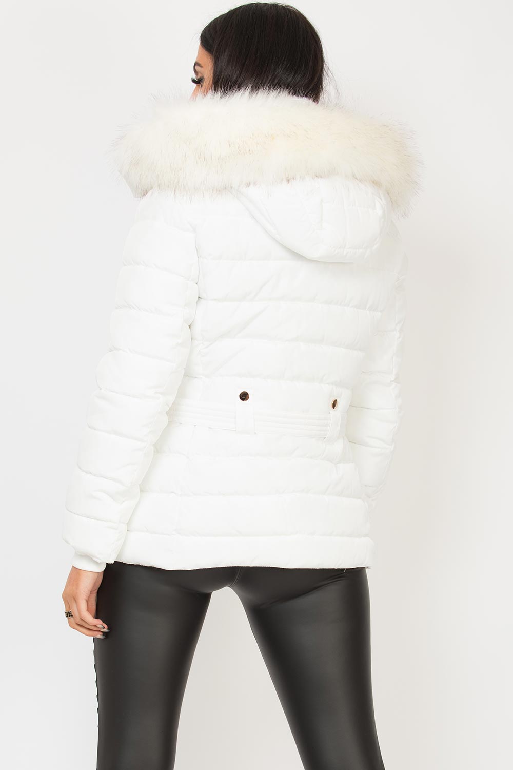 Puffer jacket with big faux fur hood in white, thick padded puffer style, extremely warm, weather resistant, zip fastening, pockets, hooded and detachable faux fur hood. Adjustable belt on the back. This padded puffer jacket is on top of our AW wish list. Style it with our jeans and sock boots to complete the look. Also available in other colours.