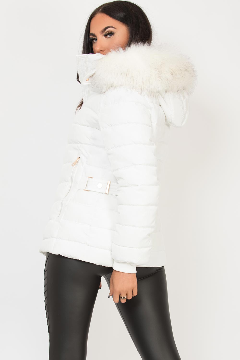 Puffer jacket with big faux fur hood in white, thick padded puffer style, extremely warm, weather resistant, zip fastening, pockets, hooded and detachable faux fur hood. Adjustable belt on the back. This padded puffer jacket is on top of our AW wish list. Style it with our jeans and sock boots to complete the look. Also available in other colours.