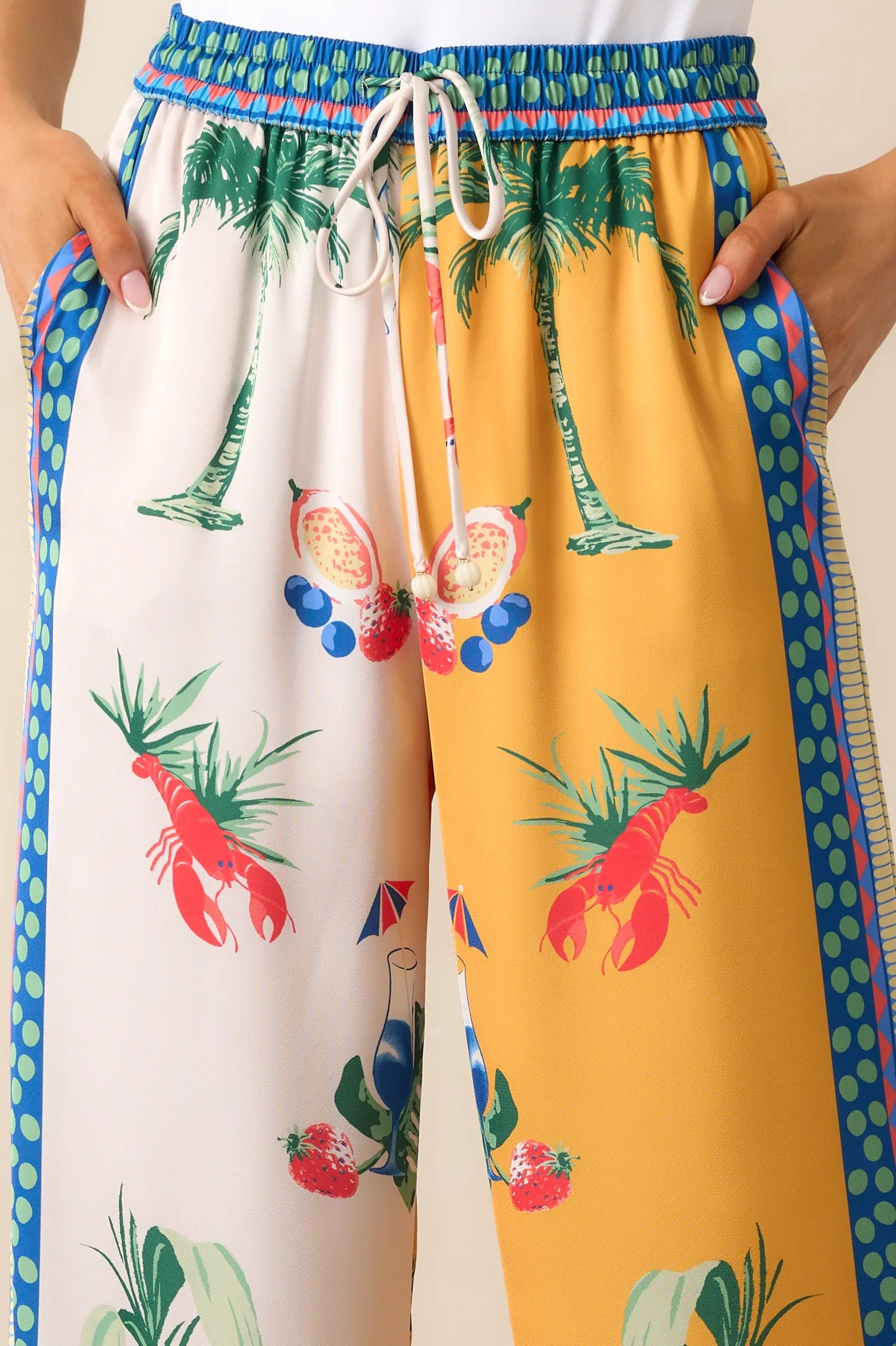 The Deep Yellow Colorblock Coastal Print Set bring a burst of sunny charm to your wardrobe. With a playful mix of coastal-inspired prints and a relaxed fit, they��re perfect for lounging or strolling by the beach in effortless style. These yellow Set feature a colorblock design with various prints and coastal icons, an elastic high rise waistband, adjustable self-tie drawstring, and functional pockets.