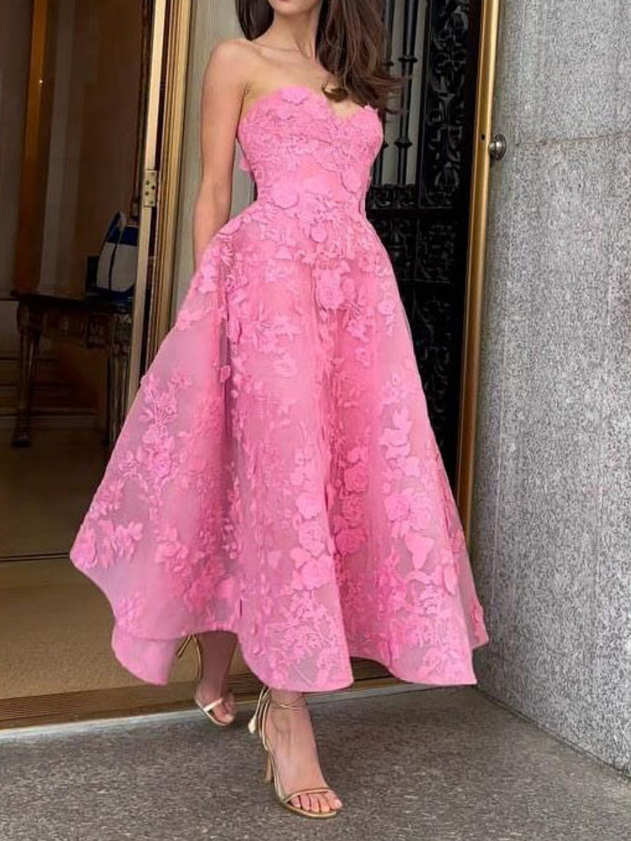 Tea-length, strapless dress in 3D lace with full skirt and fitted sweetheart bodice.�