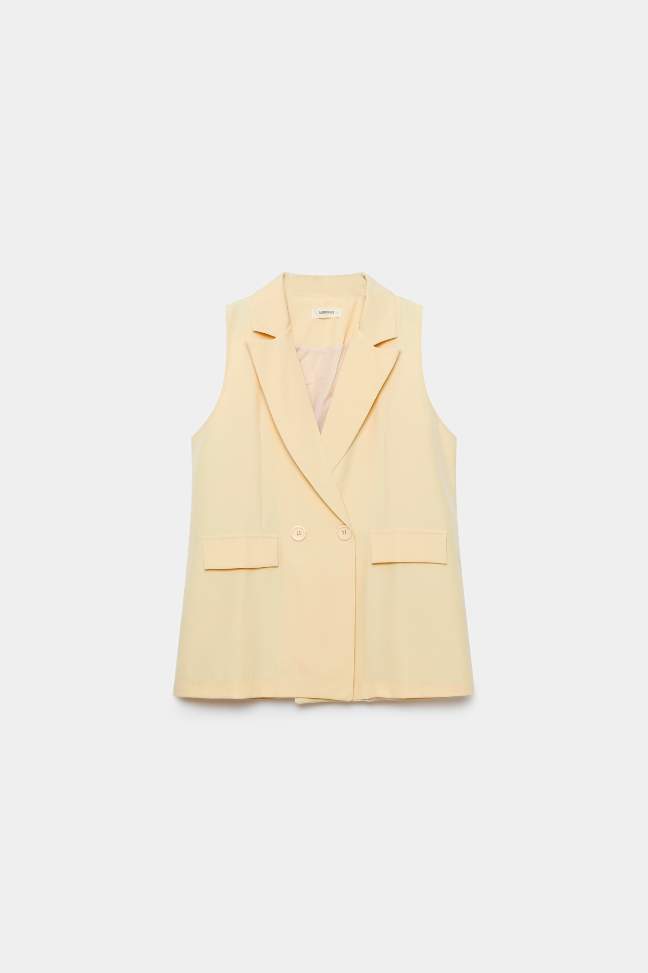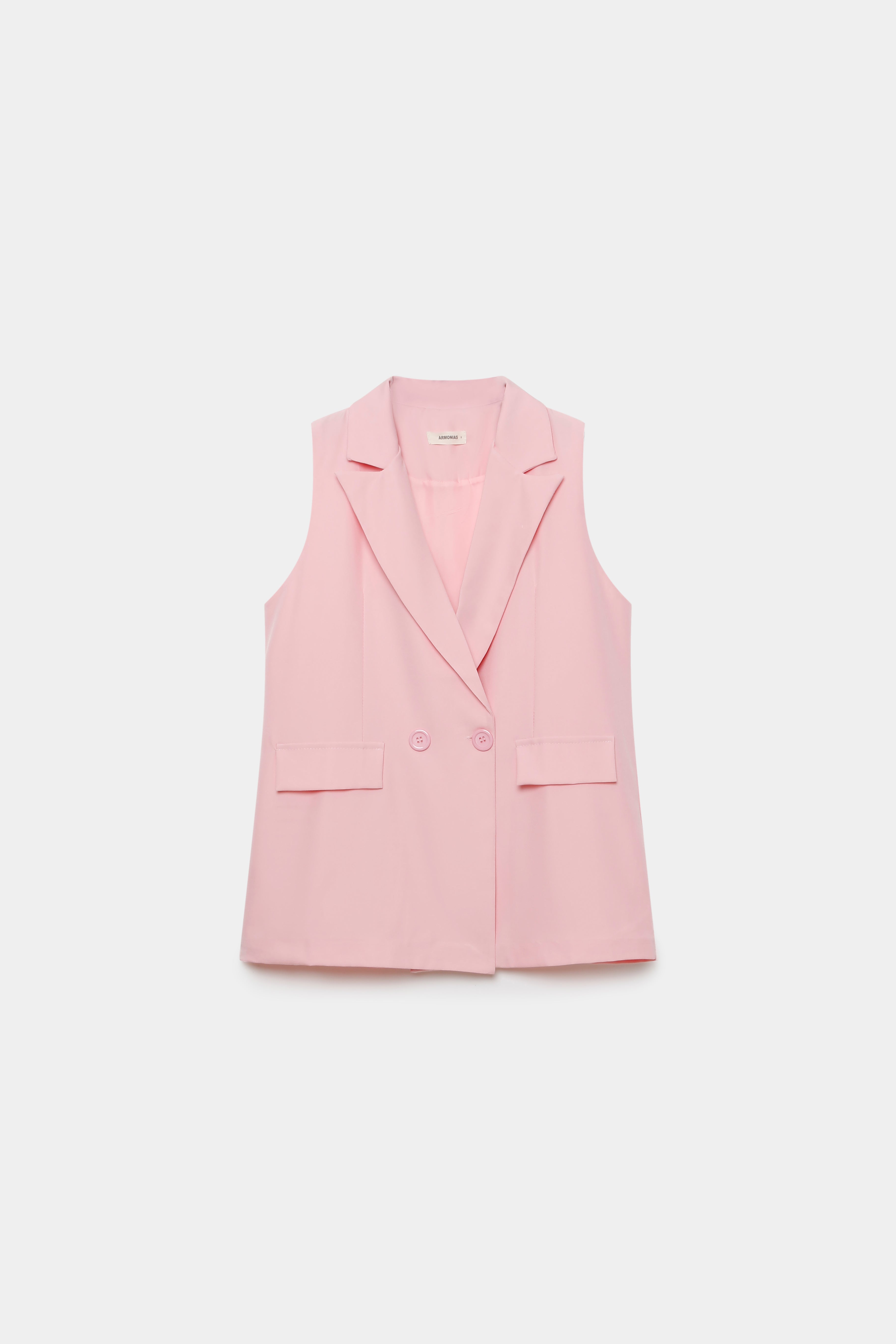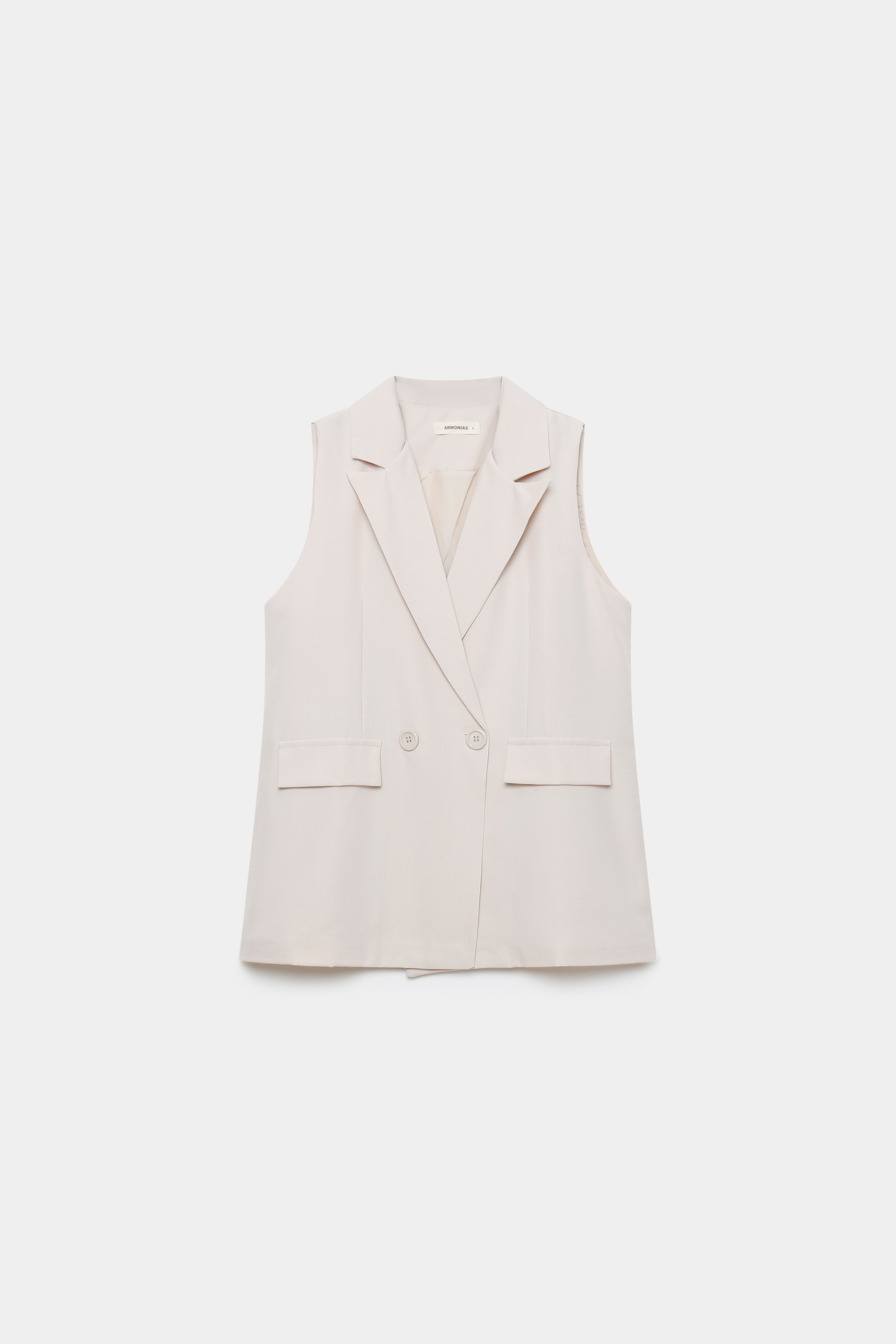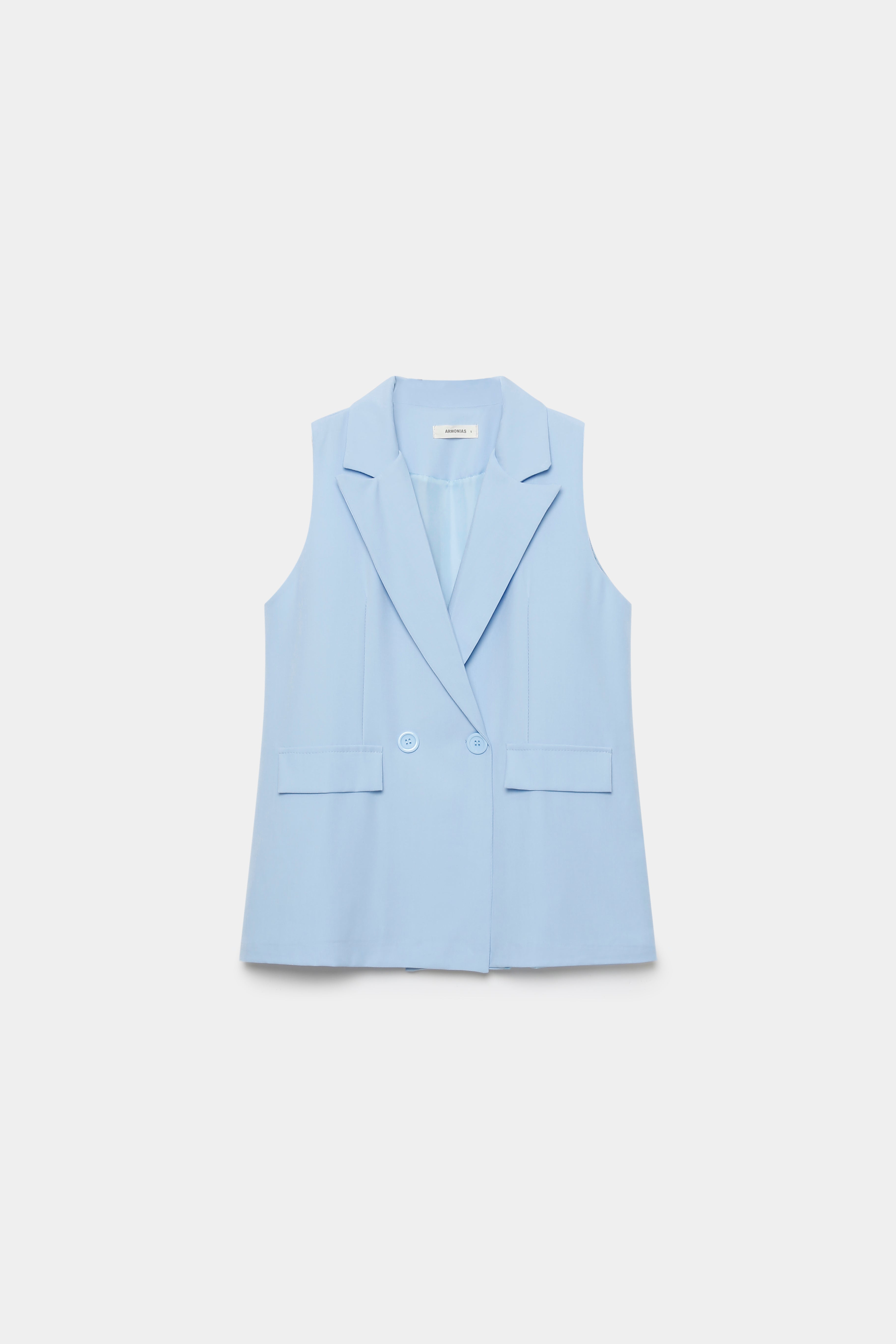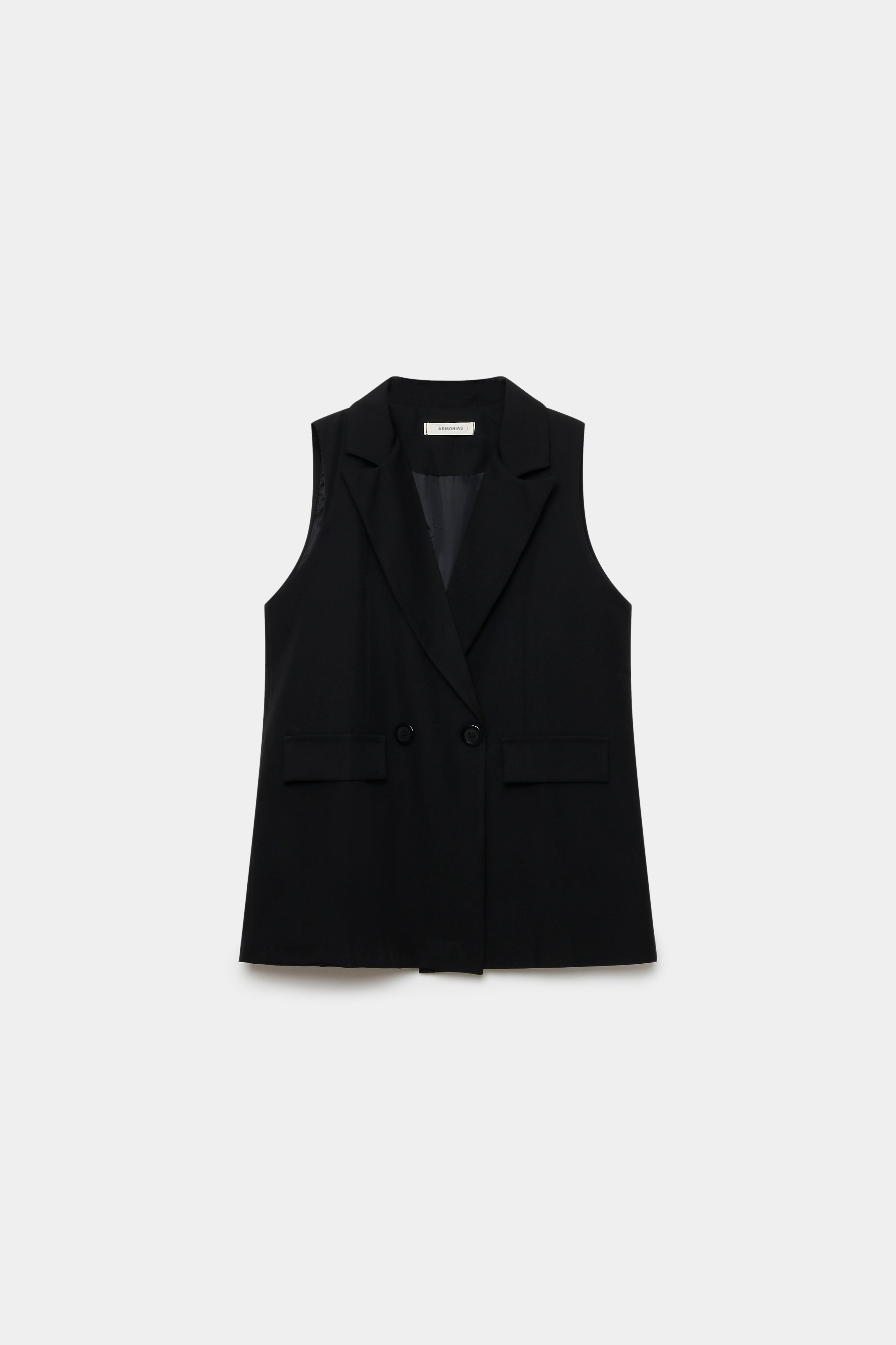Chaleco de cuello solapa y manga sisa. Cierre frontal cruzado con botones