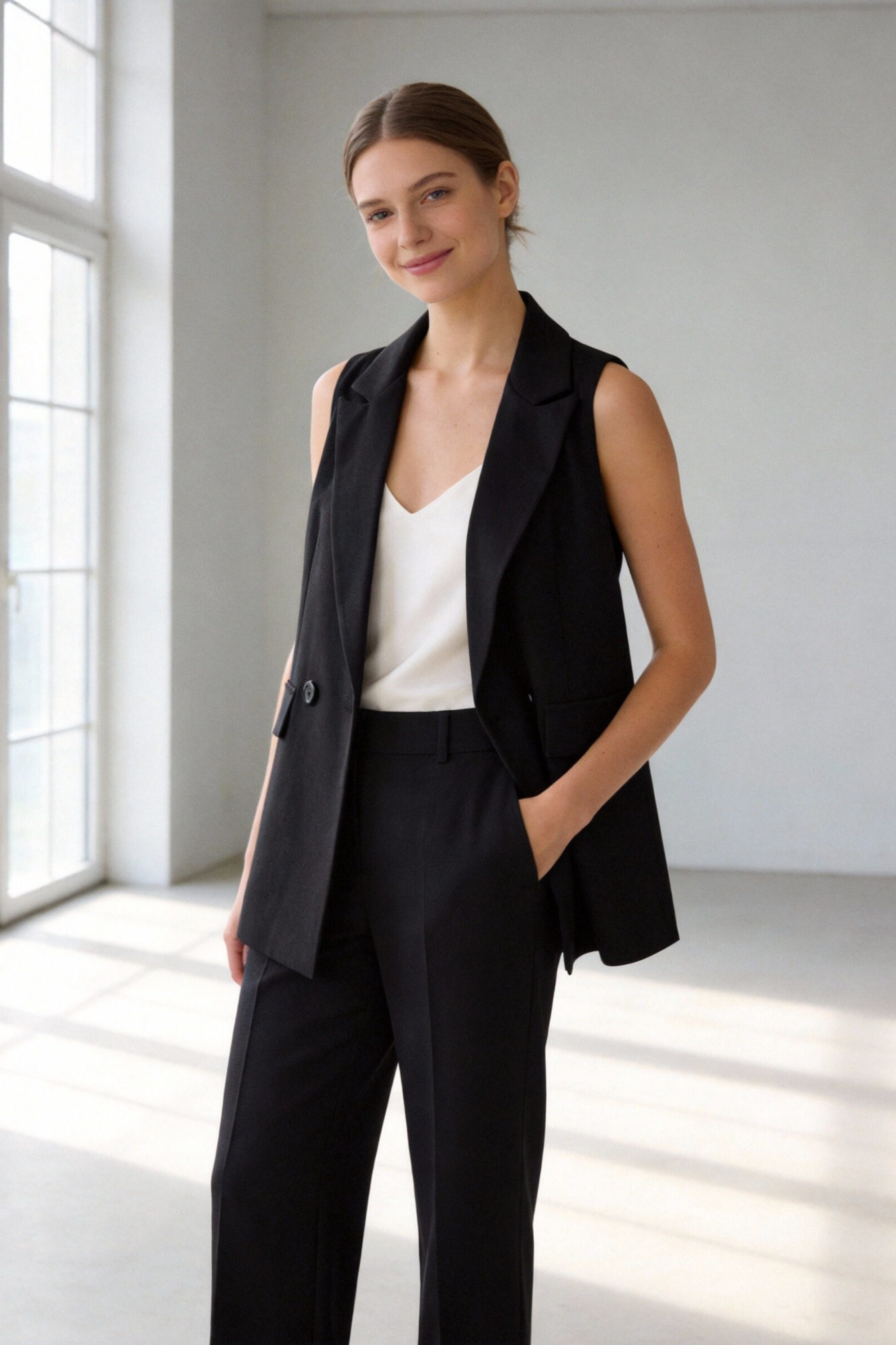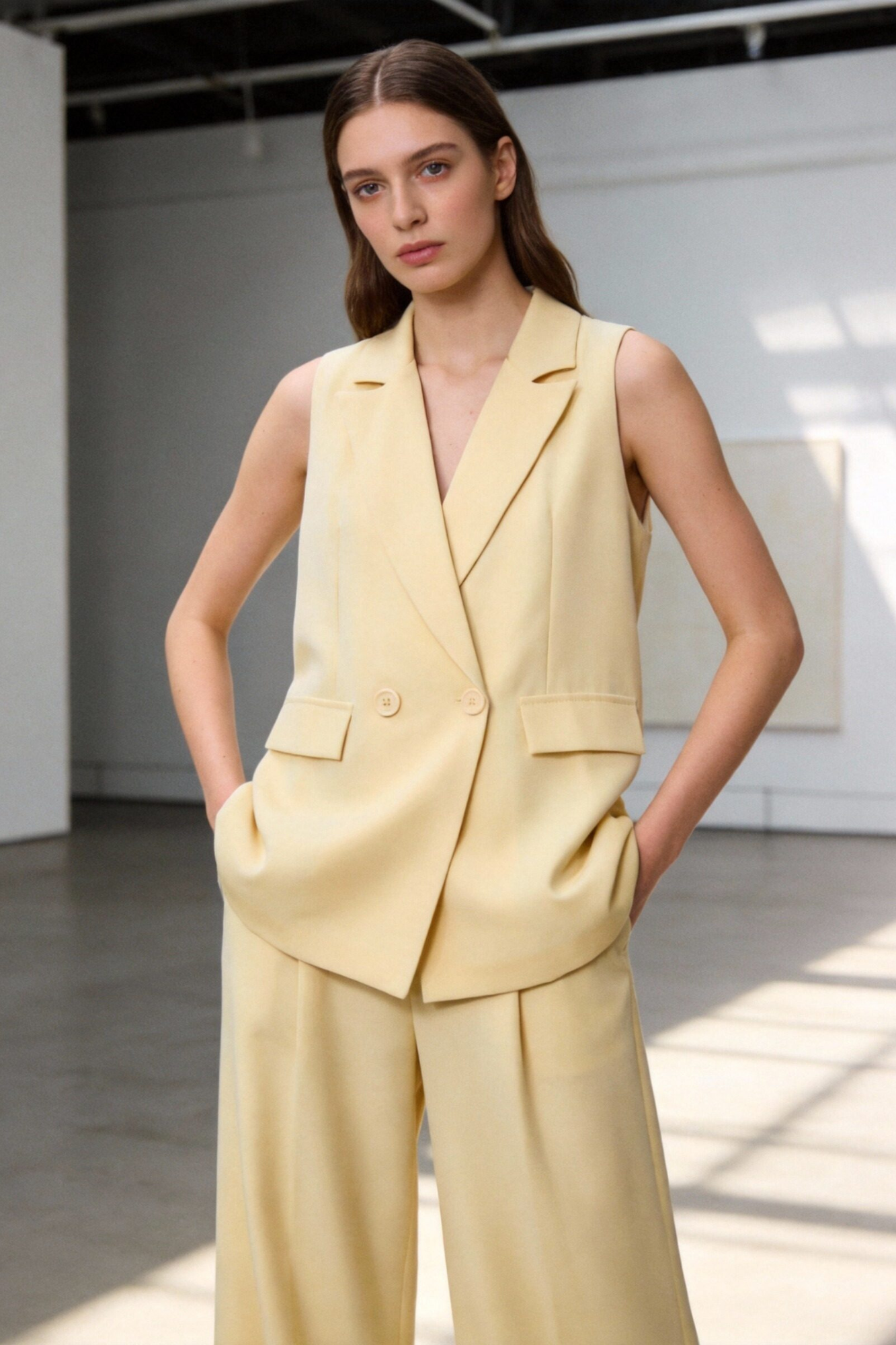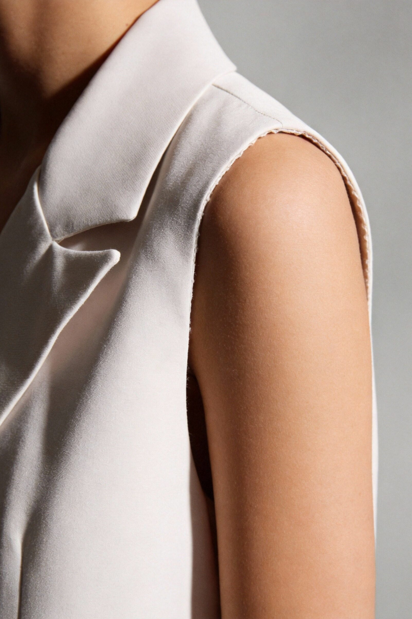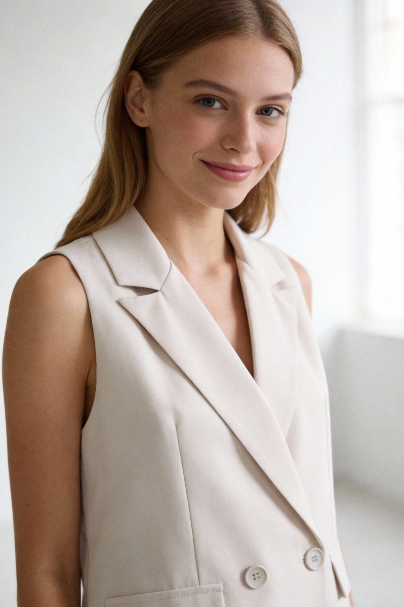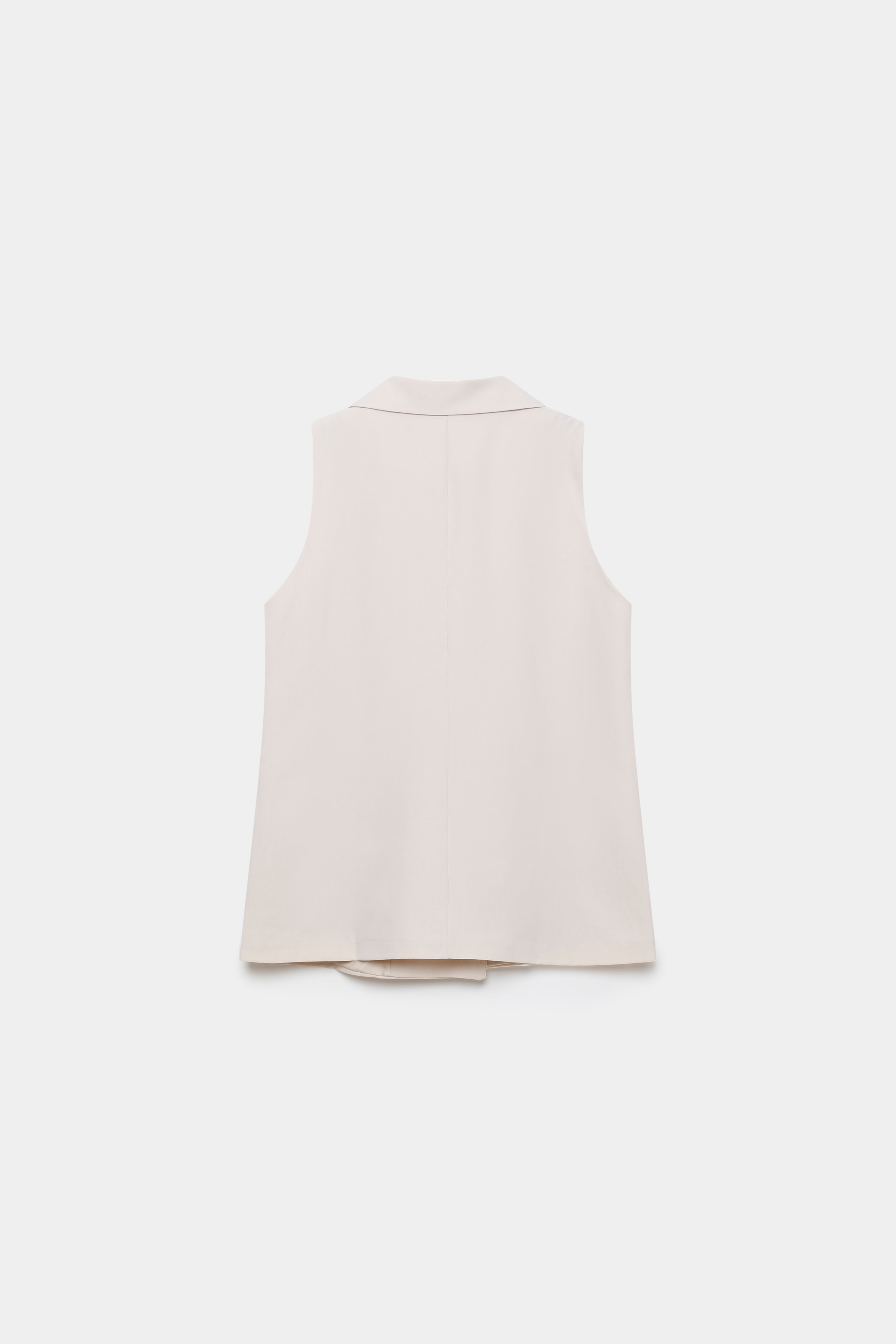 Chaleco de cuello solapa y manga sisa. Cierre frontal cruzado con botones