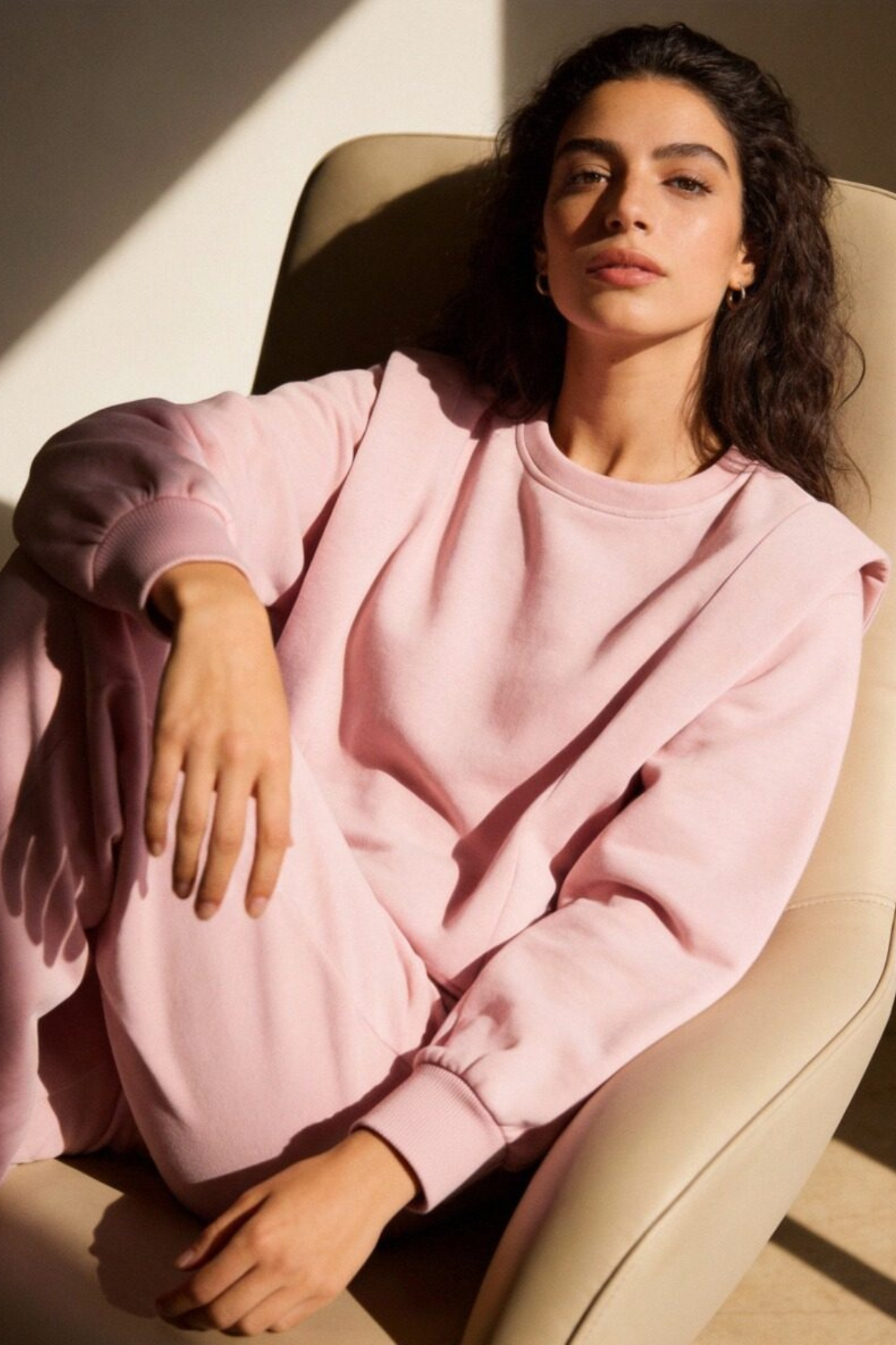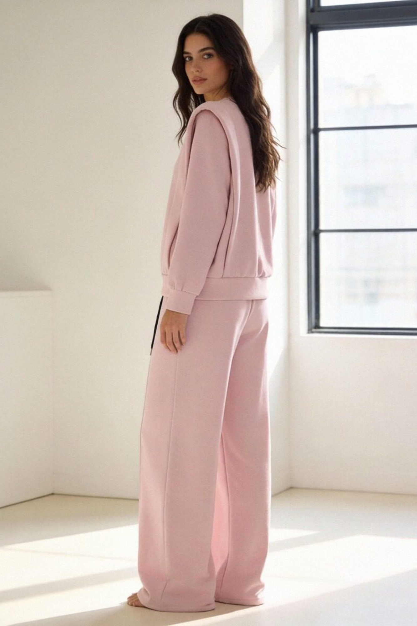 Tejido efecto felpa. Cuello redondo. Efecto hombreras. Manga larga. Pantalón de tiro alto. Bolsillos laterales. Cintura elástica y ajustable.