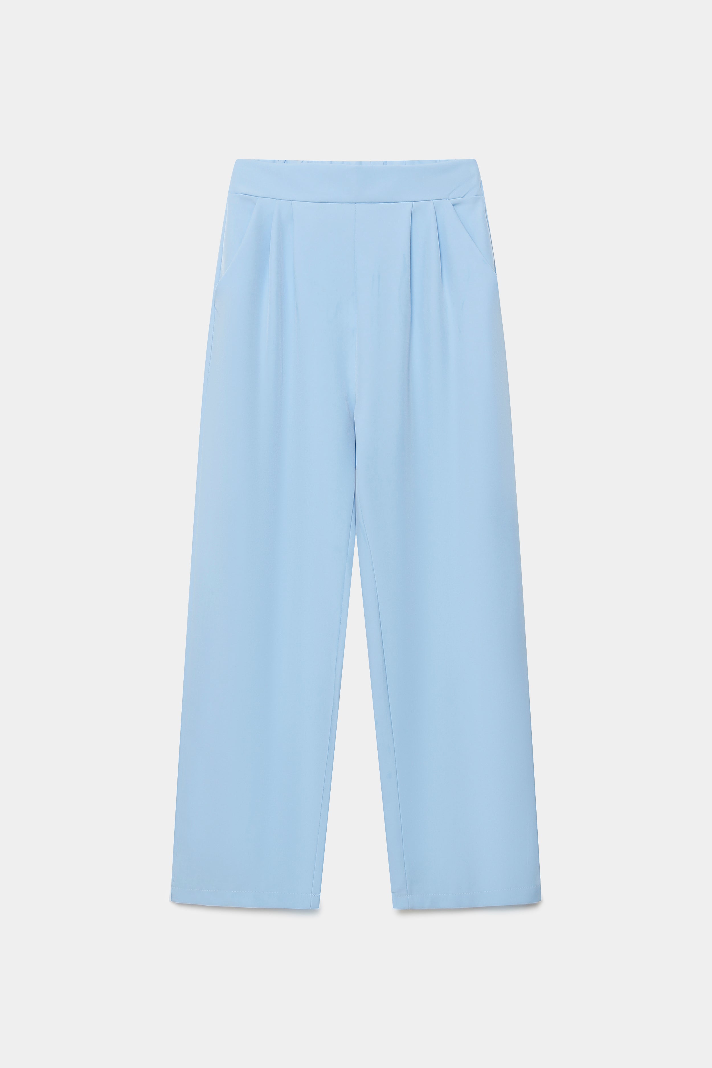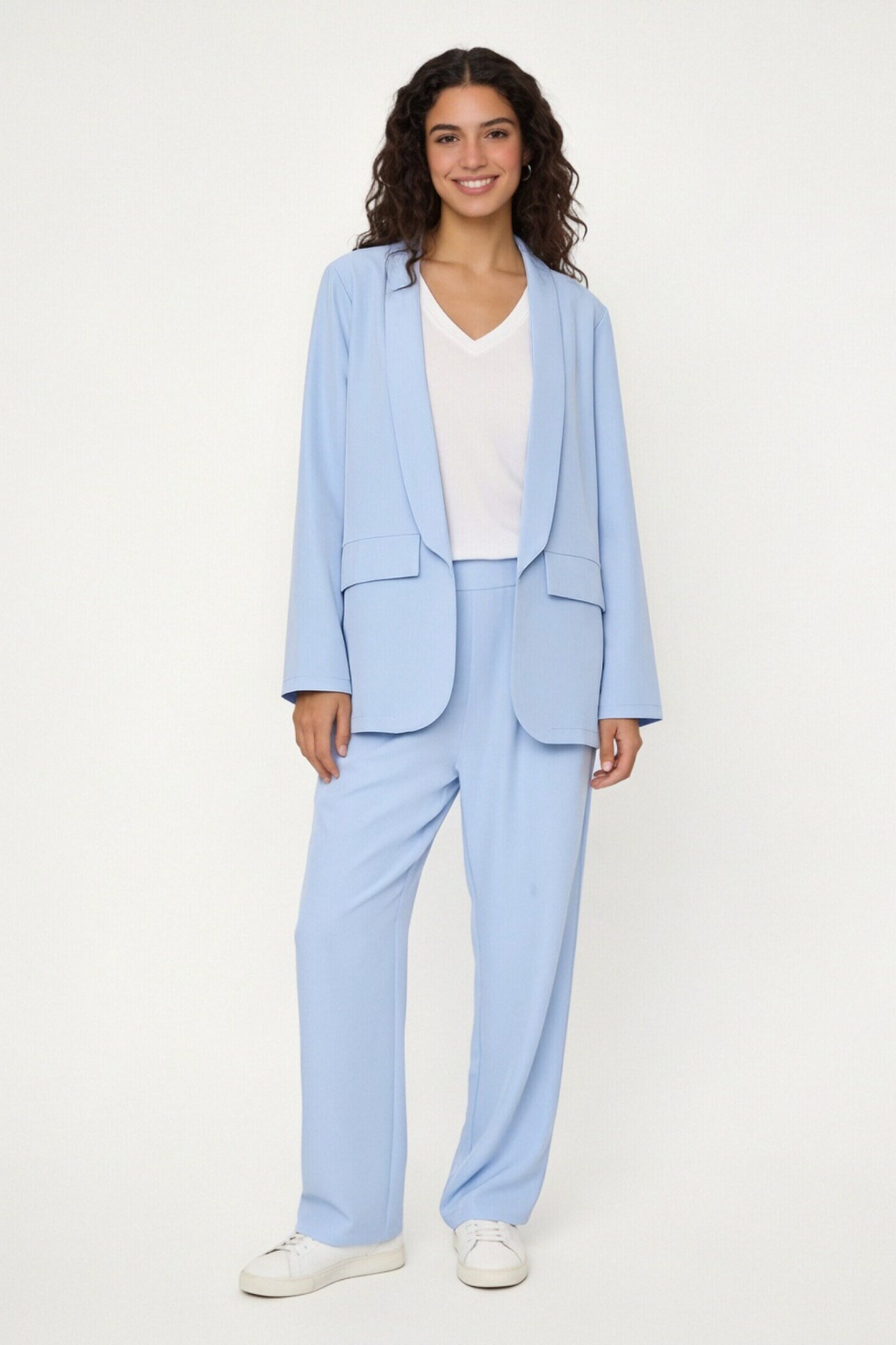 Conjunto de blazar y pantalón. Tejido fluido. Chaqueta abierta con manga larga. Bolsillos falsos. Pantalón de tiro alto. Cintura alta elástico en la trasera. Bolsillos frontales. Pinzas delanteras.
