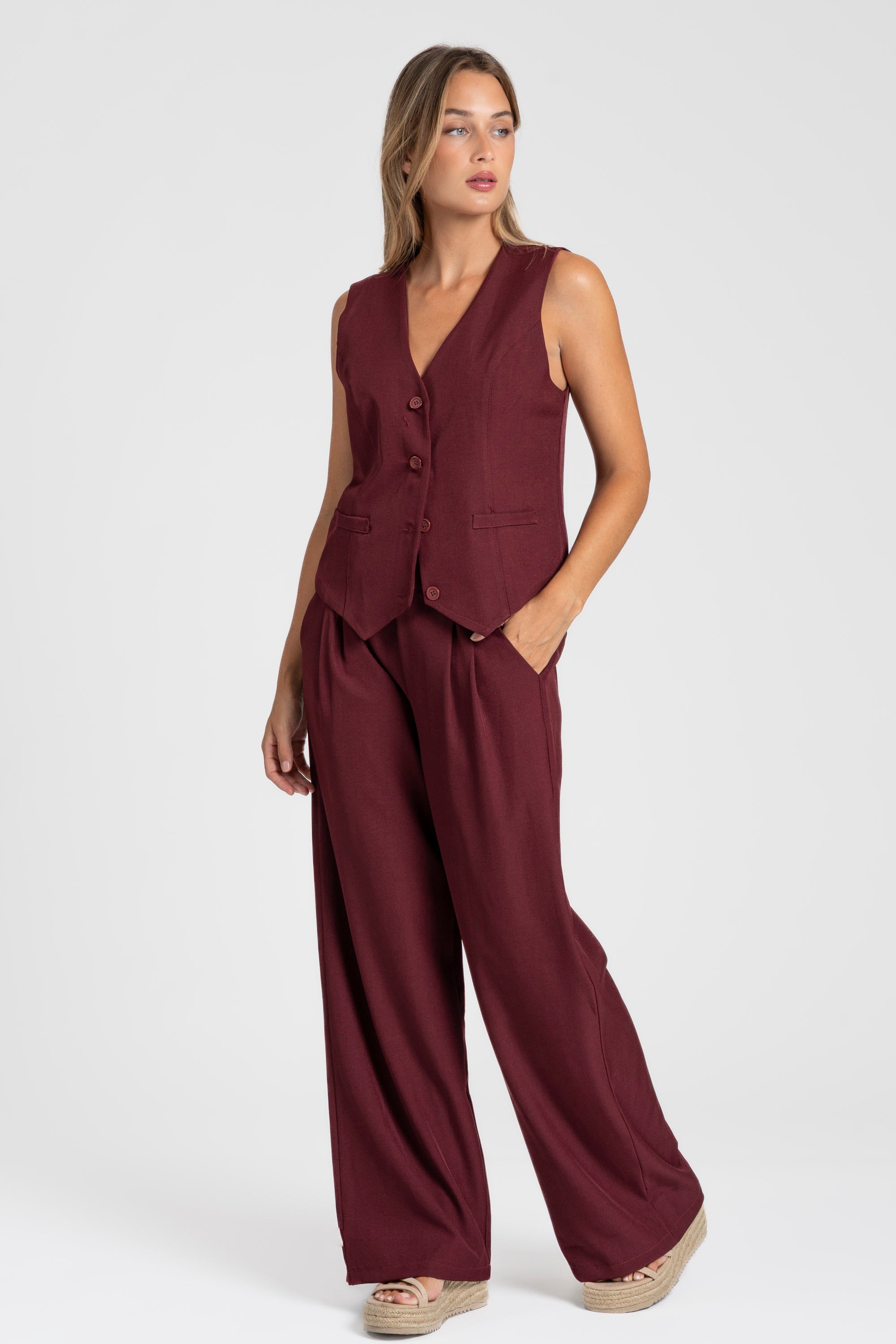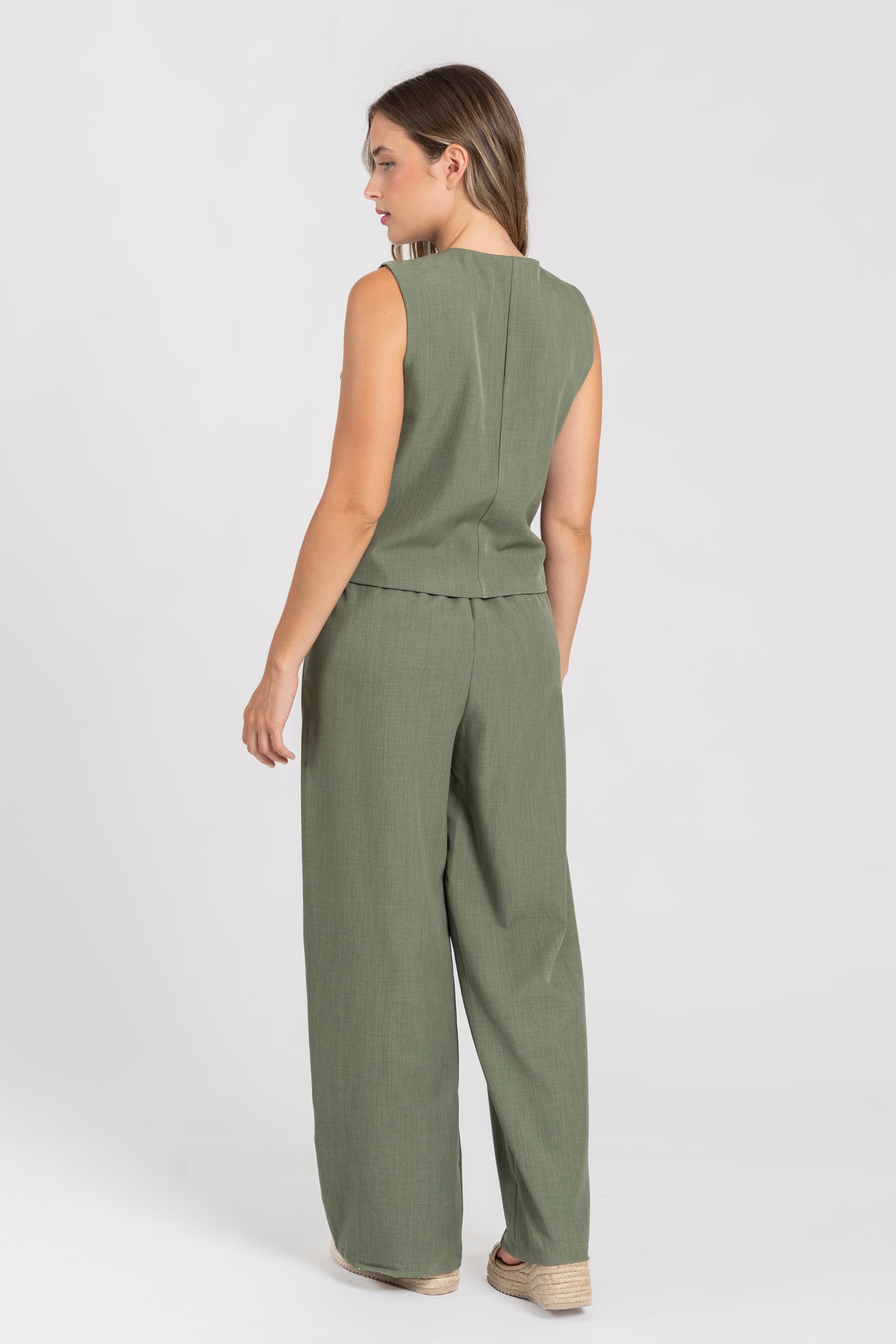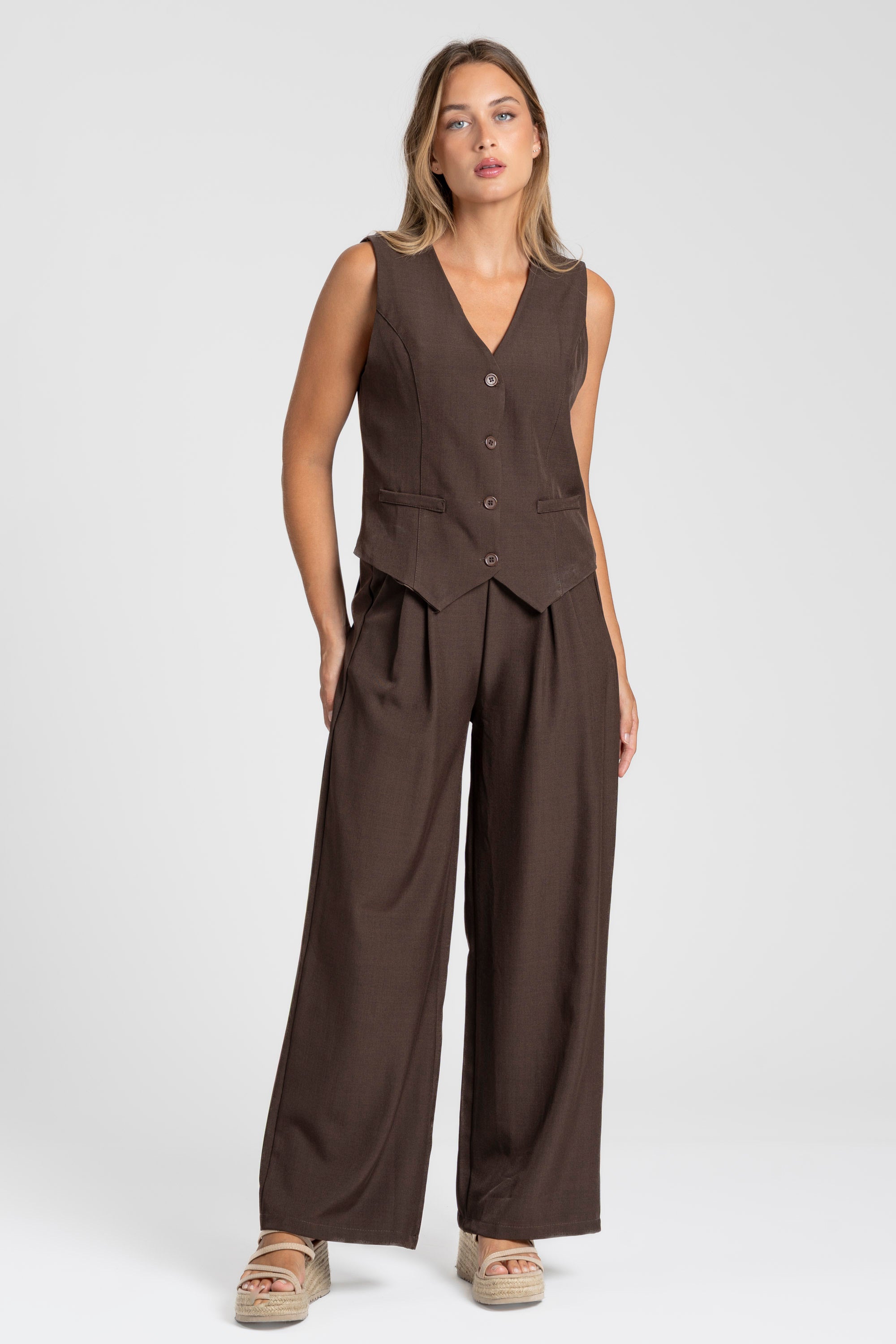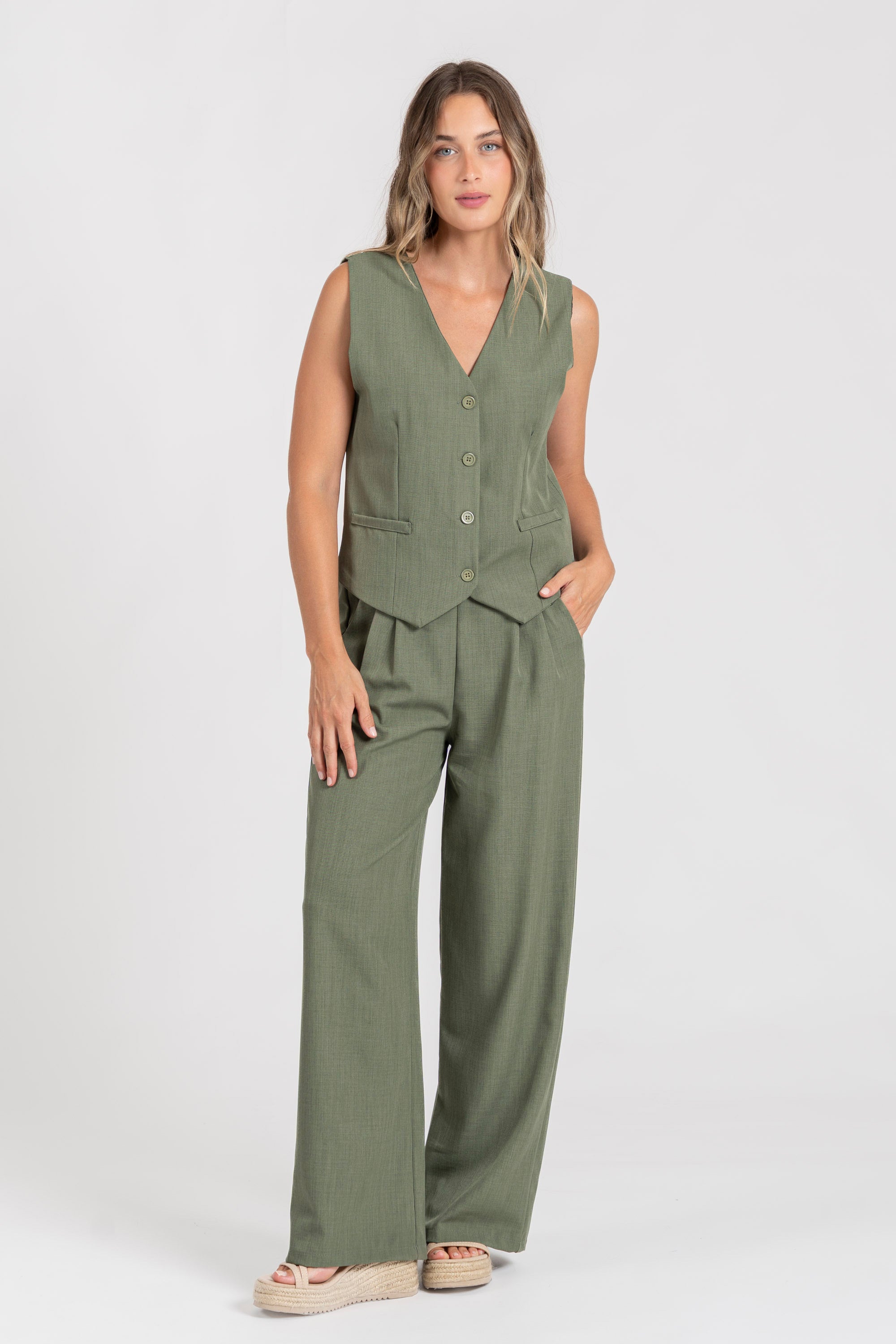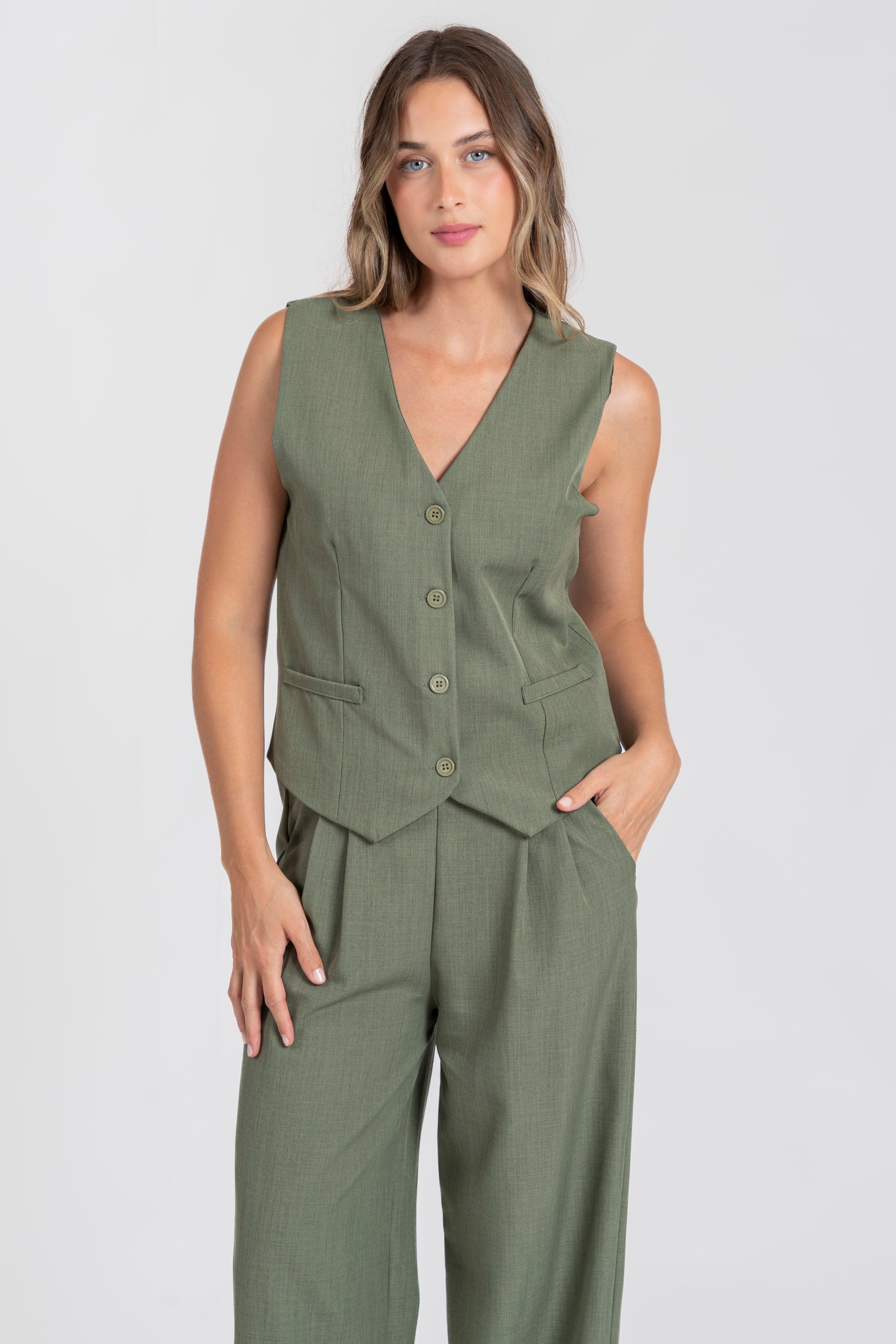 Conjunto de chaleco y pantalón. Chaleco cuello pico. Manga sisa. Cierre botones. Pantalón fluido. Cintura alta. Bolsillos laterales. Disponible en varios colores.