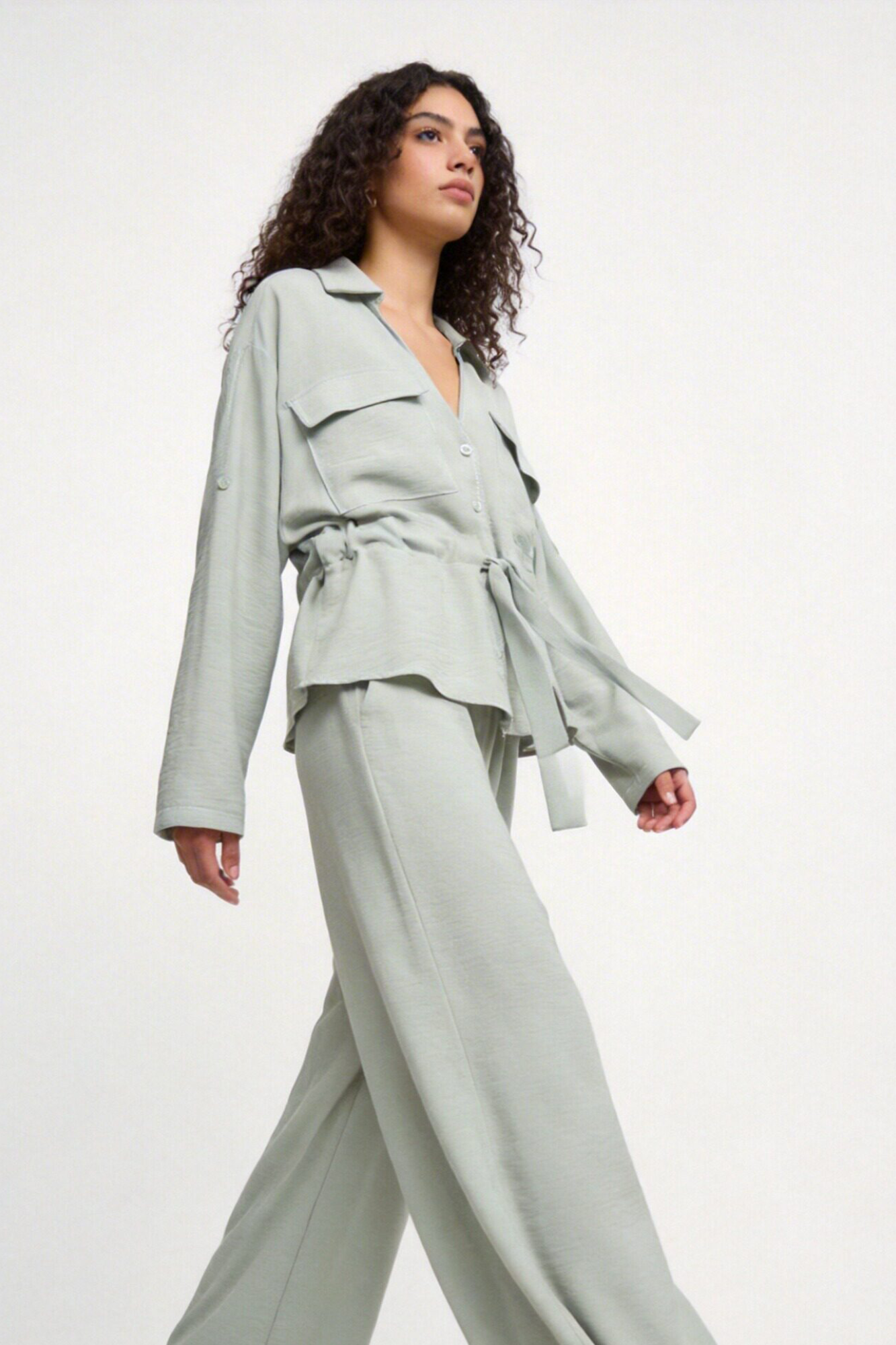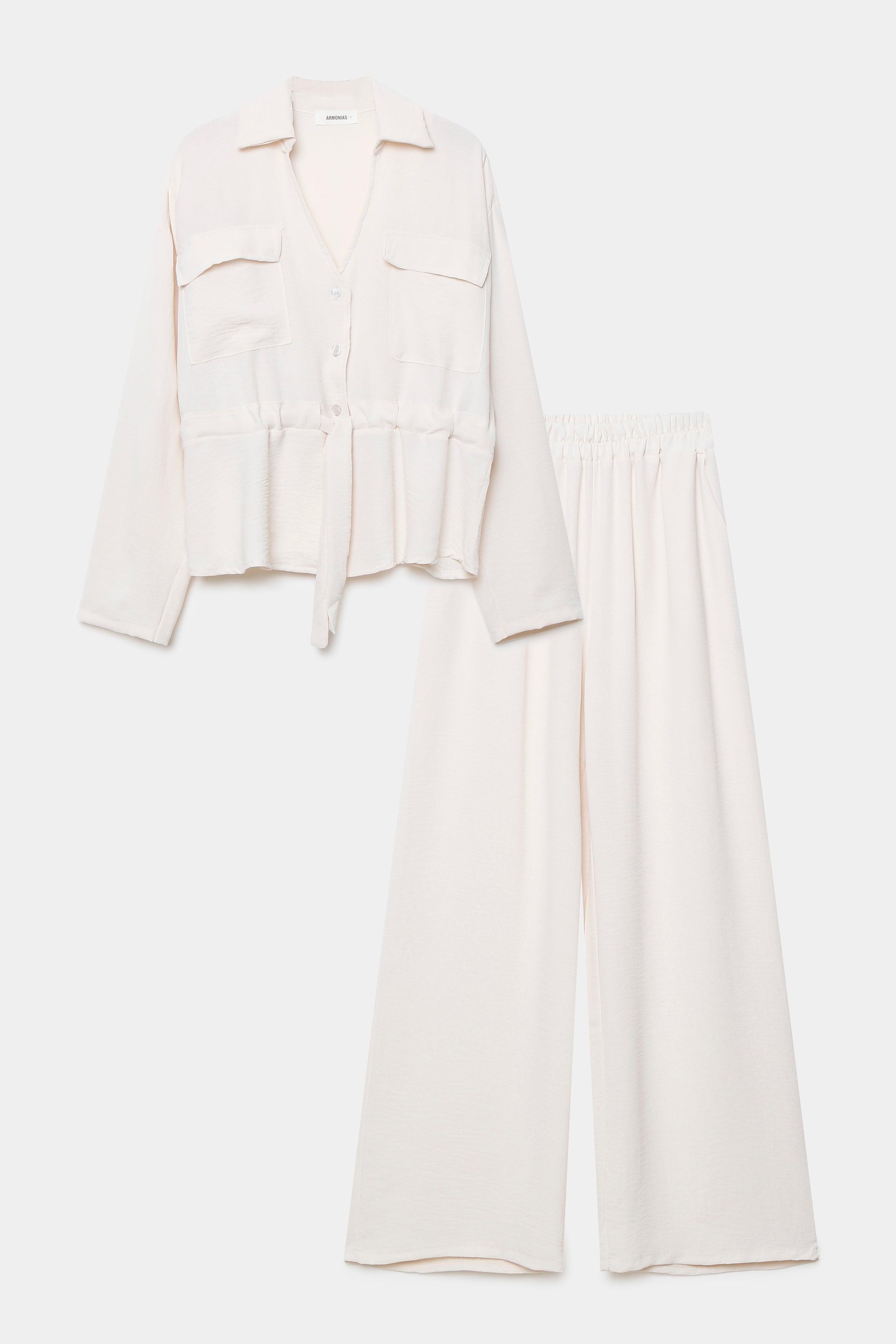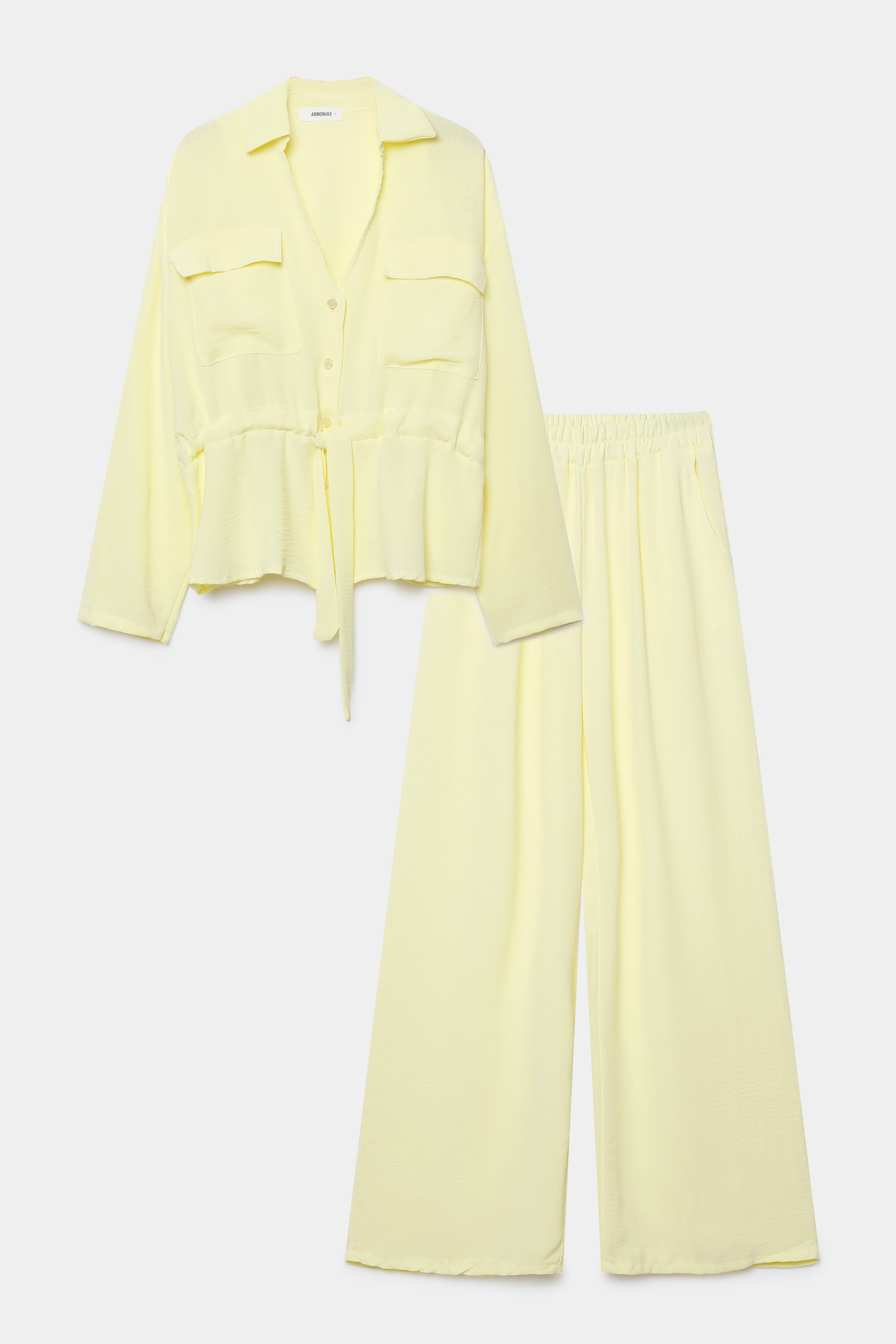 Conjunto blusa y pantalón. Tejido fluido. Cuello solapa con escote pico. Cierre de botones frontales y lazada. Manga largas con botón ajustable. Dos bolsillos tipo parche en el pecho con solapa. Cintura ajustable con cordón del mismo tejido que crea un efecto fruncido. Pantalón de tiro alto con cintura elástica. Corte amplio y recto.