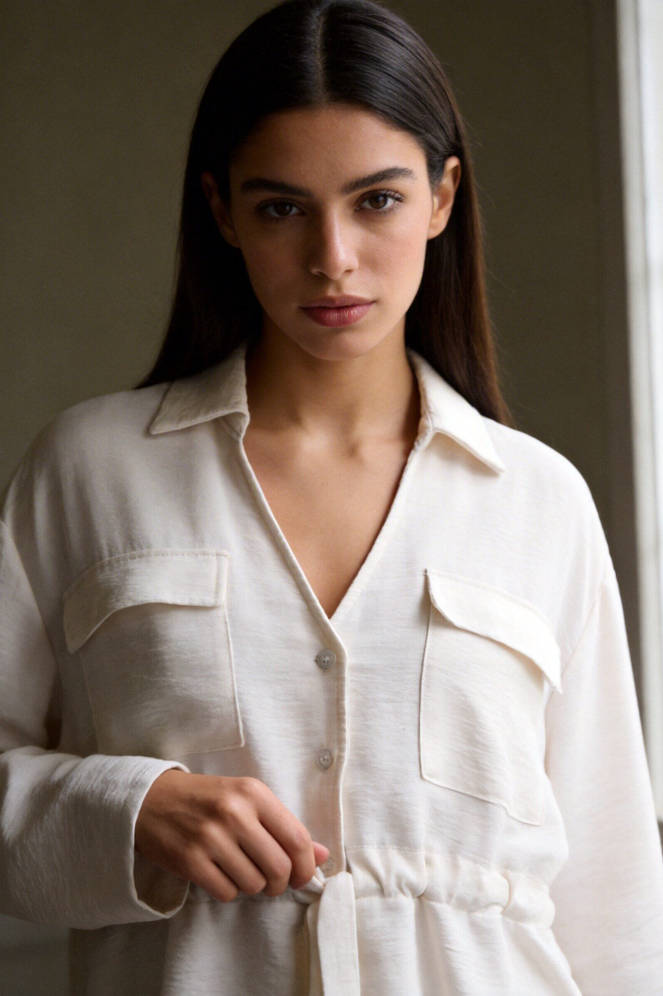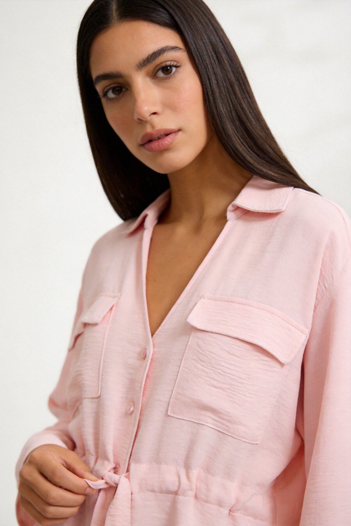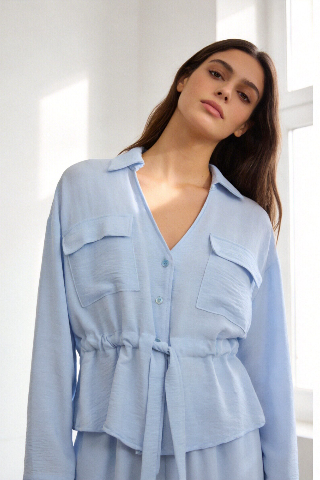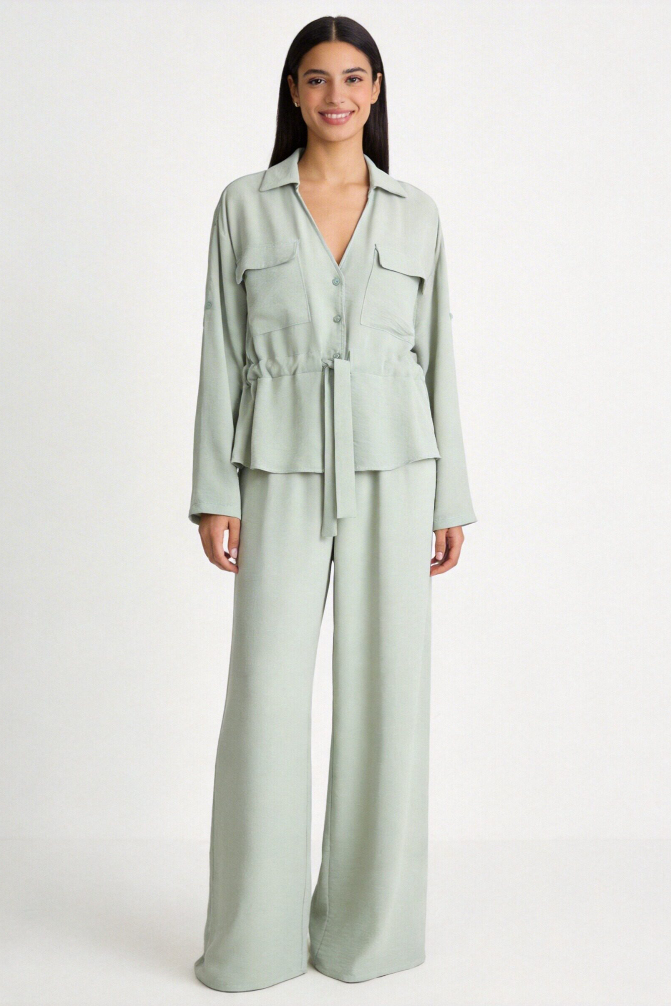 Conjunto blusa y pantalón. Tejido fluido. Cuello solapa con escote pico. Cierre de botones frontales y lazada. Manga largas con botón ajustable. Dos bolsillos tipo parche en el pecho con solapa. Cintura ajustable con cordón del mismo tejido que crea un efecto fruncido. Pantalón de tiro alto con cintura elástica. Corte amplio y recto.