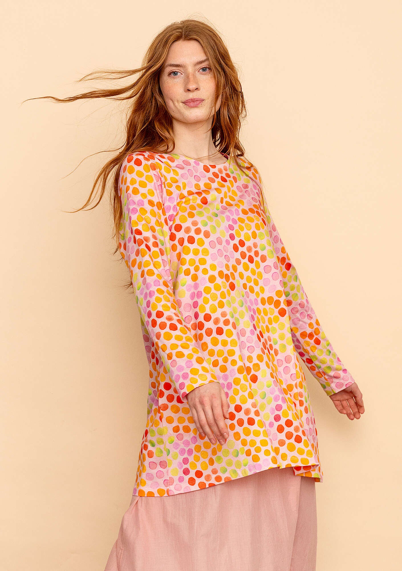 • Patterned tunic with jaunty dots that are digitally printed to capture the fluidity of watercolours. Round neck tunic with a simple silhouette, full-length sleeves and side pockets. Gently flares out towards the hem.