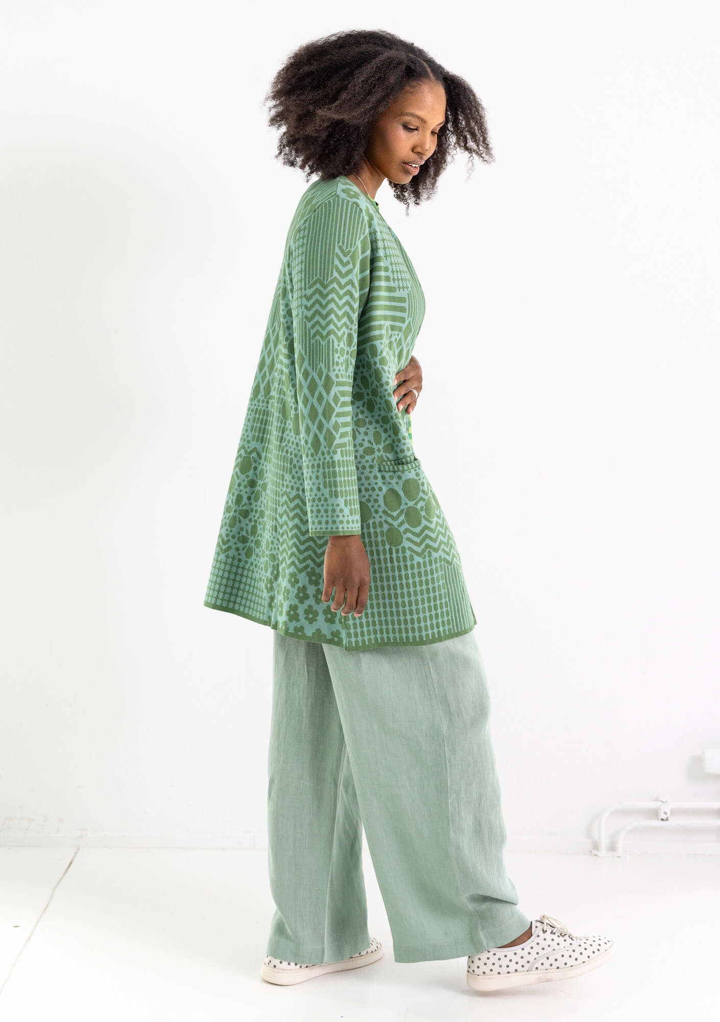 Jacquard cardigan with full-length sleeves. Double-sided, two-tone pattern in easy-wear colours. Extremely beautiful on the inside too. Subtly designed pockets, striped inside. Dyed buttons.