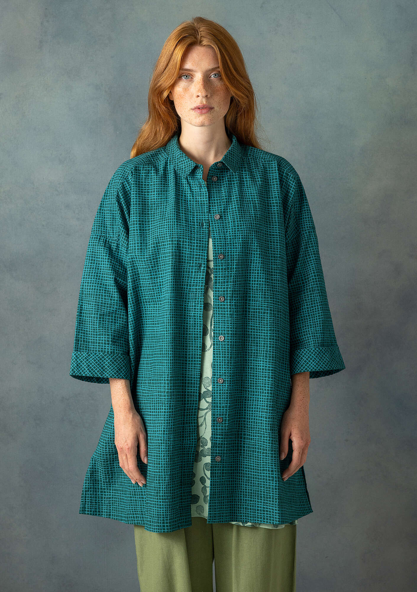 Soft cotton twill shirt tunic with an all-over printed design and button-through style. The top three metal buttons are visible and those down the skirt are hidden. Featuring a shirt collar, side-seam pockets and forward shoulder seam. Back yoke with a sewn-in loop.