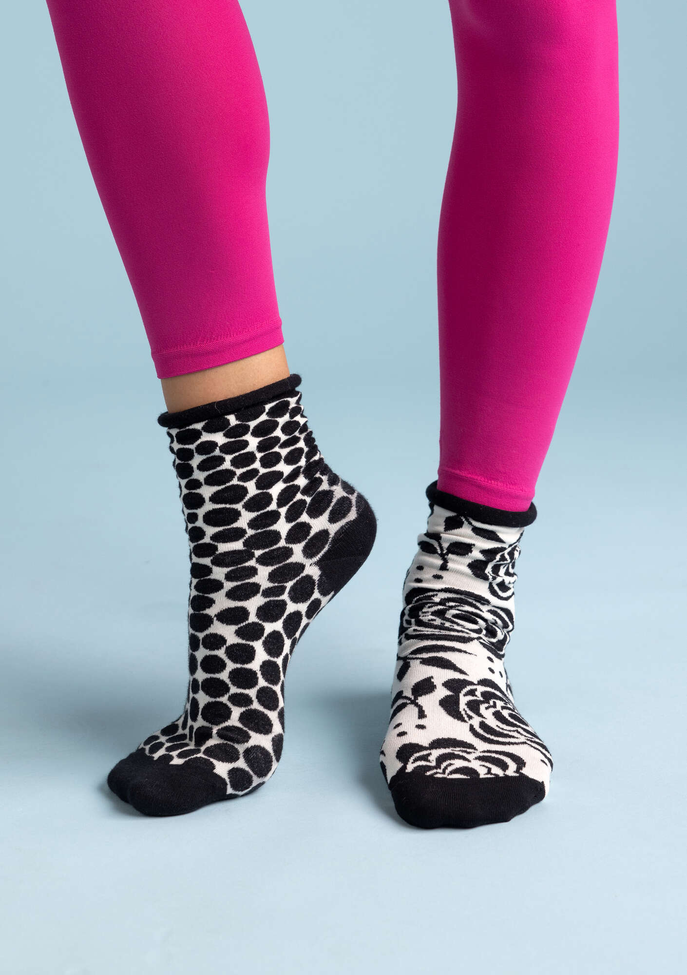 Soft and comfortable socks with rolled-edge cuff. Attractive, classic rose design.
