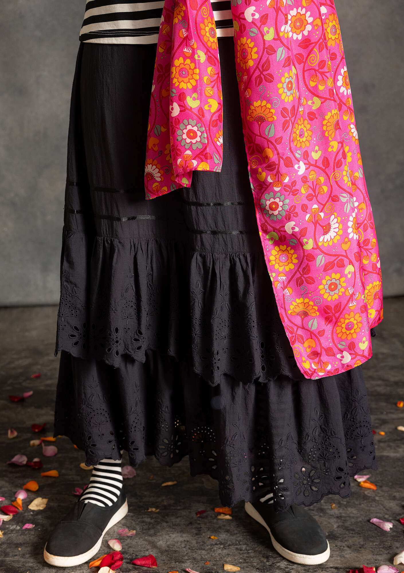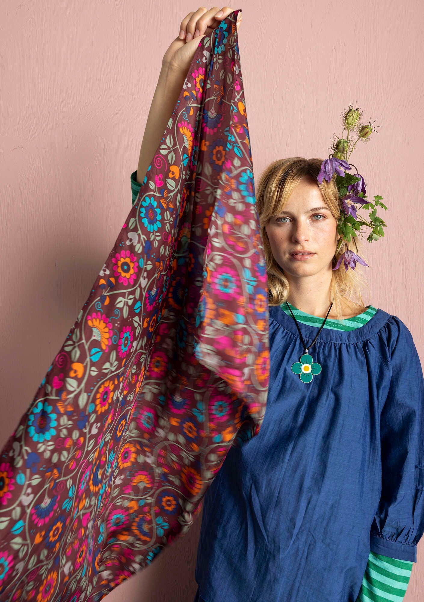 100% silk. Handwash at 30°. Use a detergent specifically for silk. Twist while damp to re-crinkle, or carefully iron the reverse side of the shawl on low heat. Made in Kundli, India.