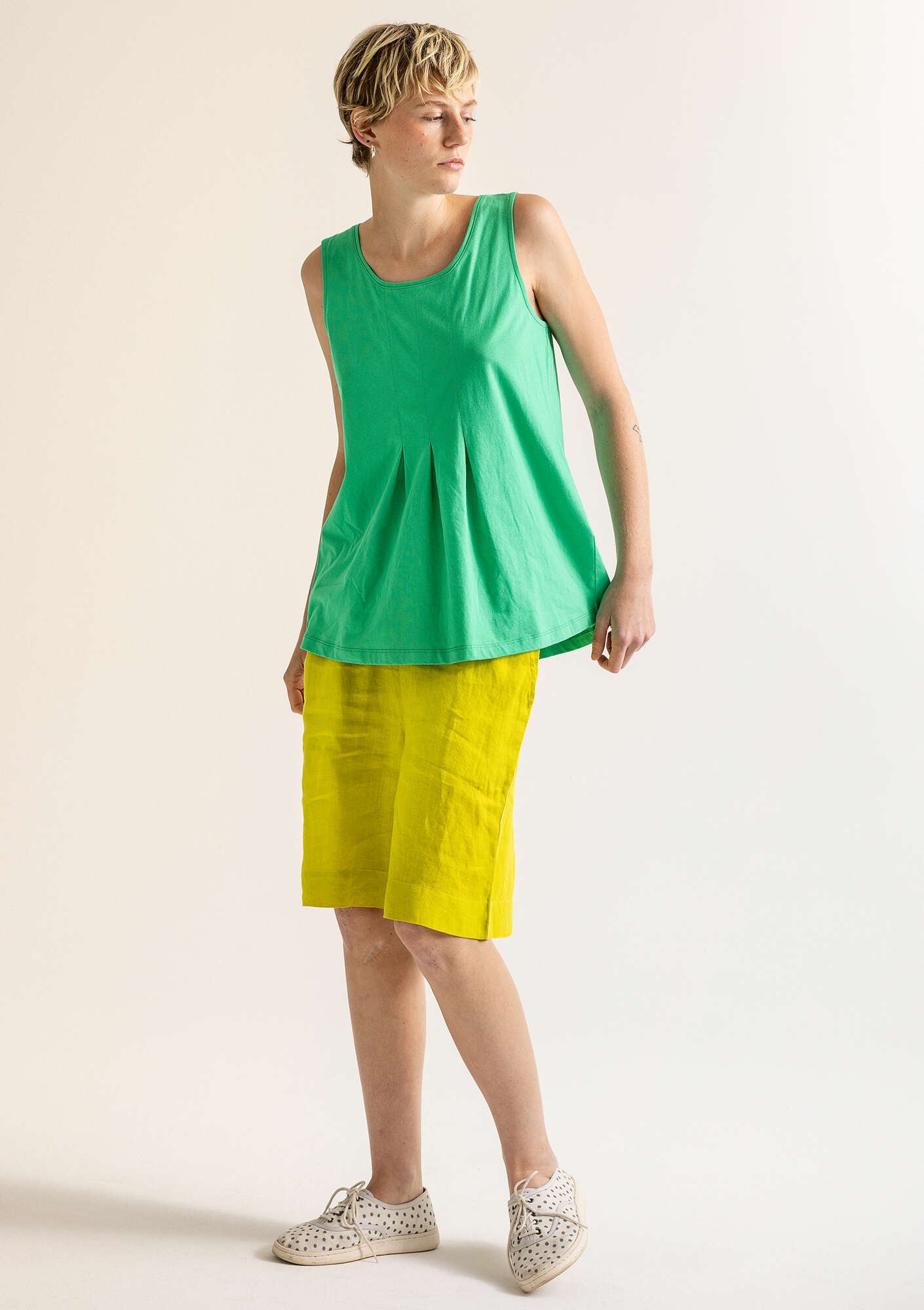 • Knee-length shorts with side pockets. Elasticated waistband with front drawstring. Choice of solid colours, a checked pattern and fine chambray weave.