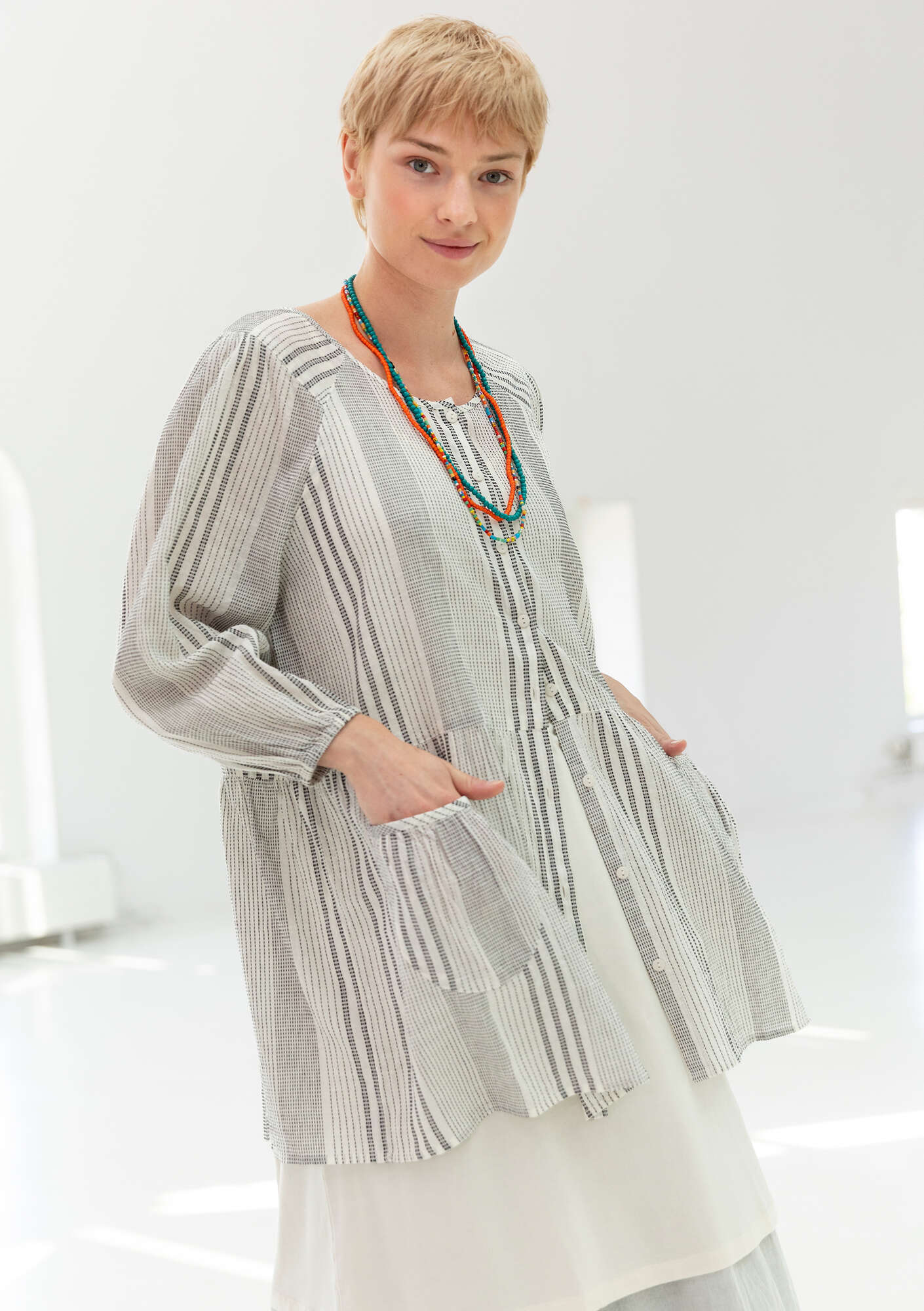 Button-through design with a seamed waist. Three-quarter raglan sleeves. Soft elasticated cuffs for a flattering fit. The fabric is gathered at the shoulders and waist to create pretty volume. Rounded patch pockets.