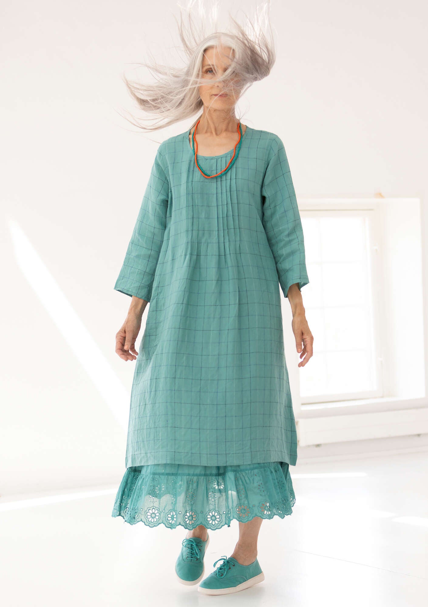 Features stitched pleating at the front. Shaped at the top, flaring gently towards the hem. Bracelet length sleeves. Comes in solid colours and with a yarn-dyed check print. Side pockets.