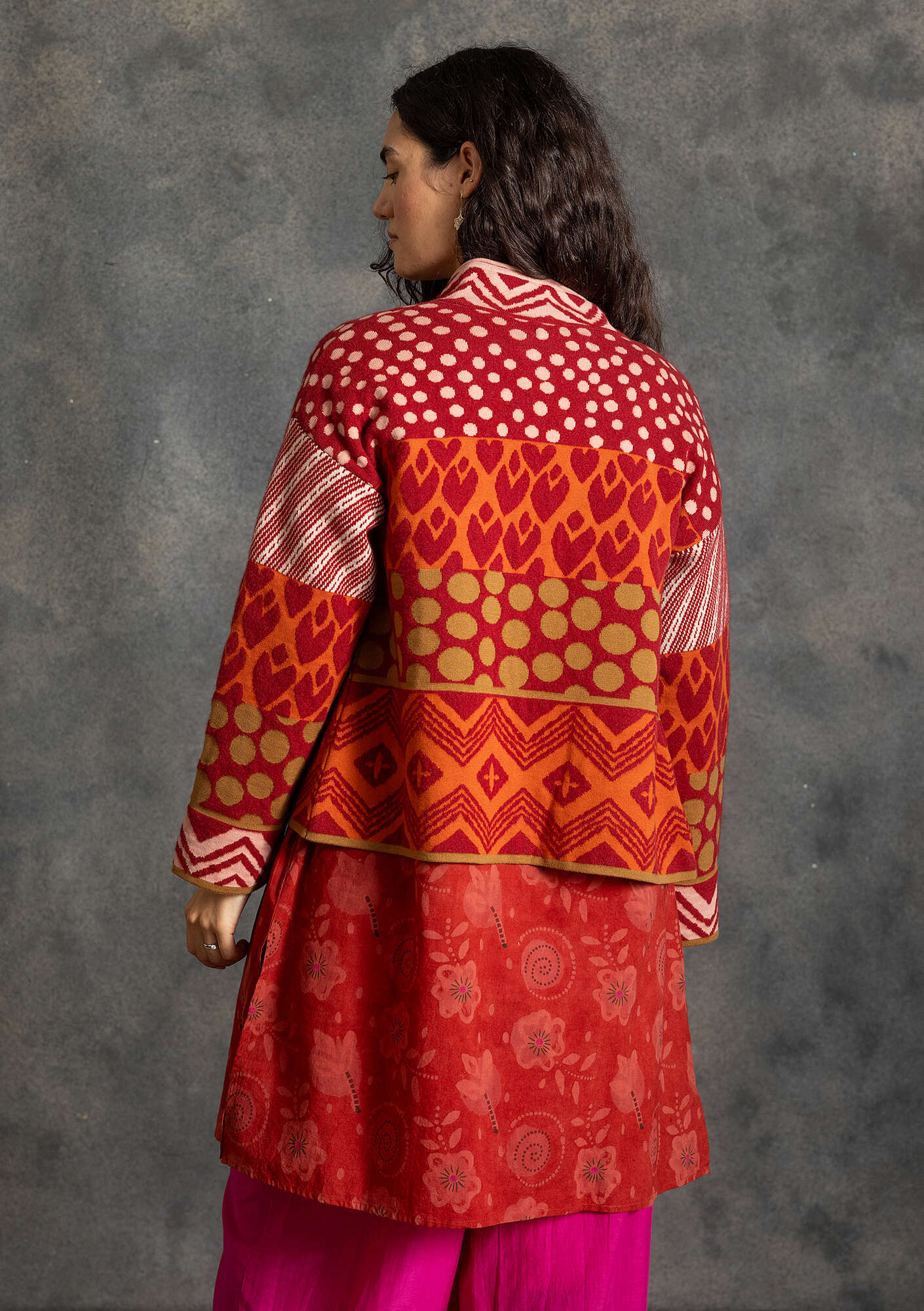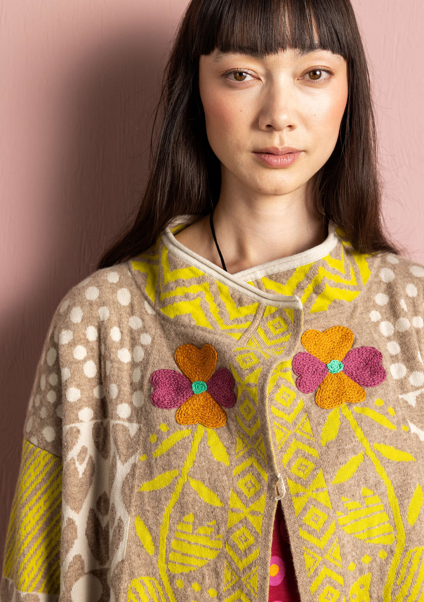 Jacquard wrap cardigan with a slightly cropped silhouette and two wooden buttons for closure. Featuring a mix of beautiful patterns, three-quarter sleeves and a neat stand-up collar. Jetted pocket and a pretty hand-embroidered flower on both sides.