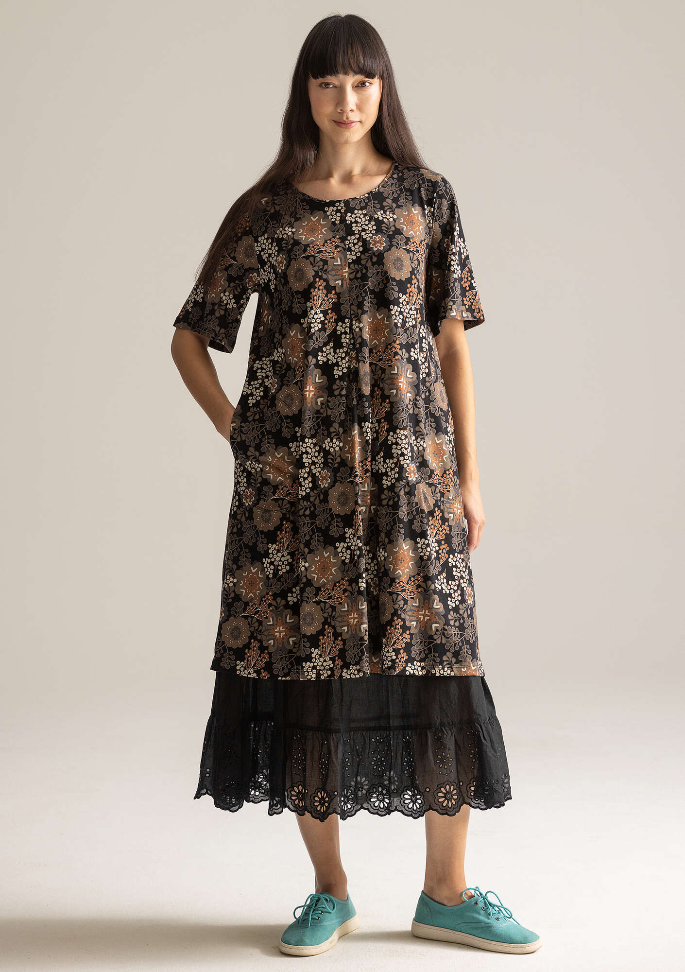 • Easy-to-wear dress with a digitally-printed design. Lovely scoop neckline and a stitched-down front box pleat. Elbow-length sleeves and inseam side pockets. Made from a cool, lightweight jersey fabric.