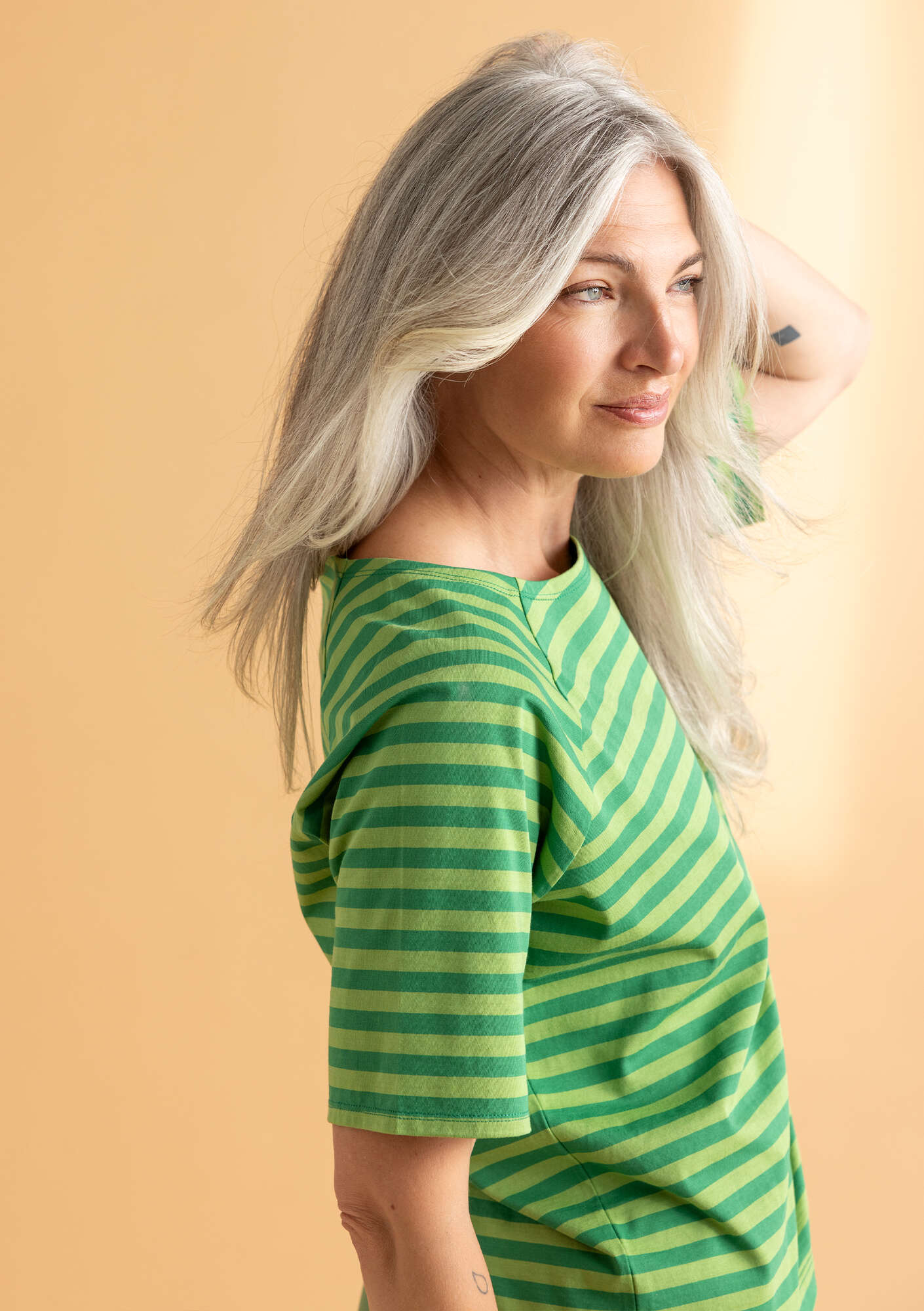 • A cropped top with an airy fit. Featuring a gentle boat neck and longline raglan sleeves. The top has a relaxed silhouette and strikingly positioned stripes.