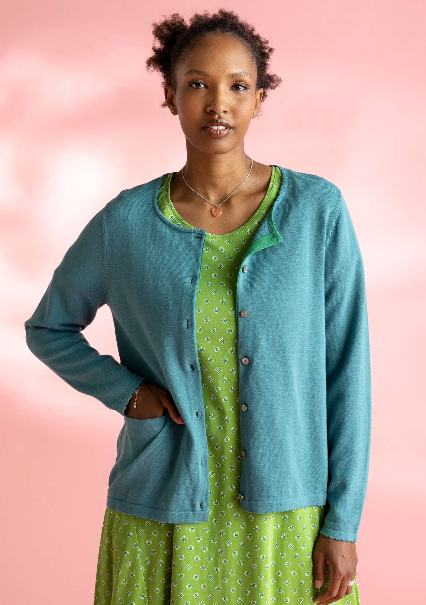 • A simple style staple finished at the neck and cuffs with delicate scalloped edges. Accent-colour rolled edging at the front and as small playful details inside. Pocket in one side. Mother-of-pearl buttons.