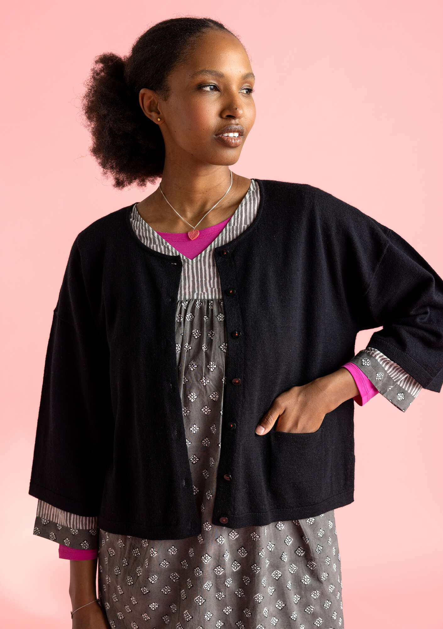 • Slightly cropped style with a generous fit. The sleeves hit below the elbow. Finished with neat ribbing around the hem and cuffs. Colour accent on the inside of the practical pocket. Slits at the sides.
