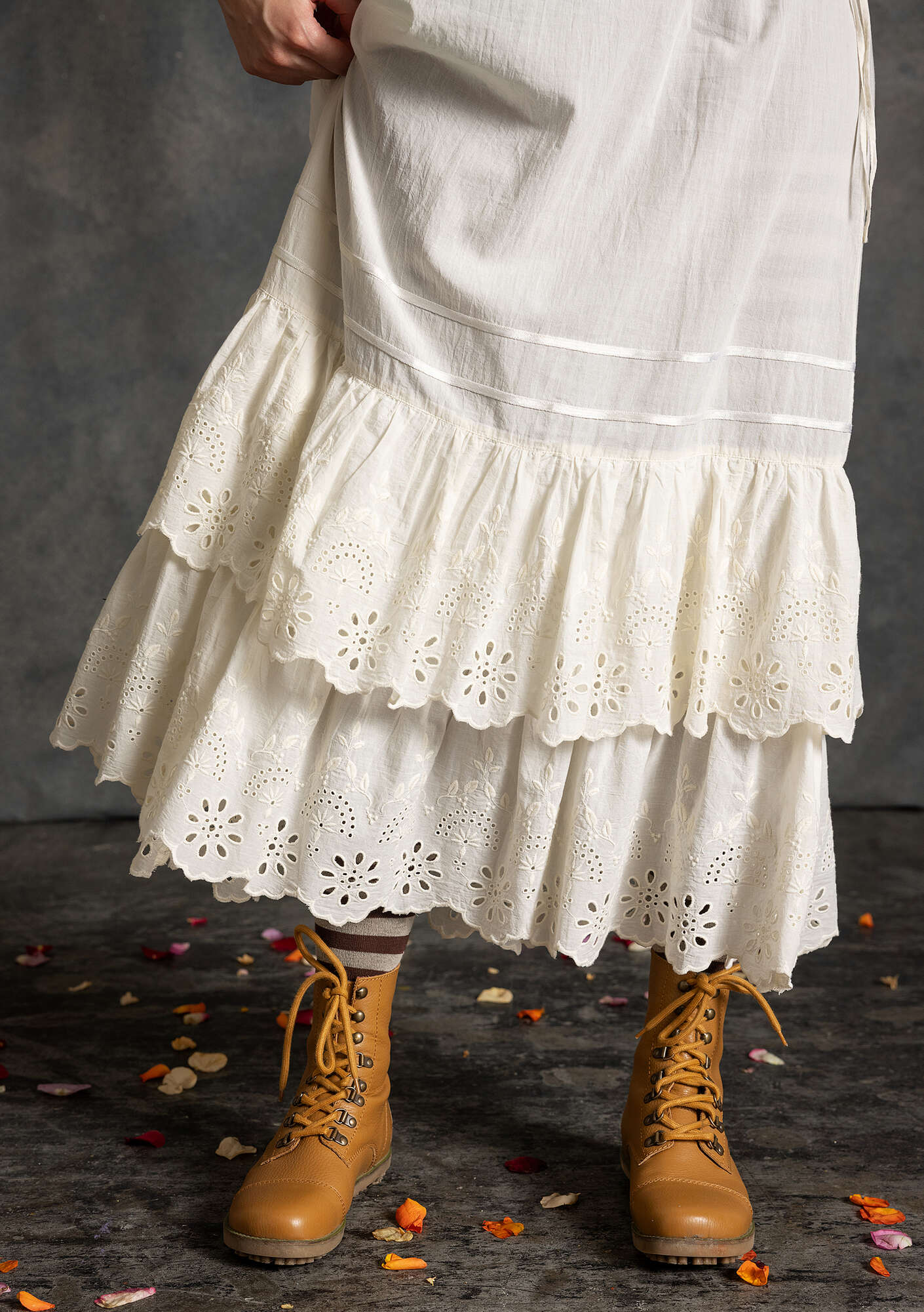 • Beautifully embellished piece that can be worn as a skirt or an underskirt. Trimmed with two rows of satin ribbon above the two broderie anglaise tiers, which are layered over one another. Elastic waistband with drawstring.