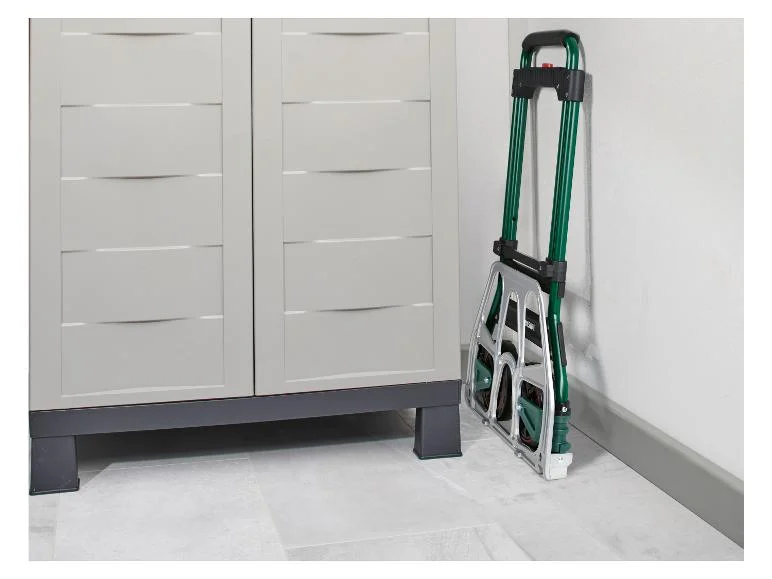 - Particulièrement plat et peu encombrant grâce aux roues rabattables - profondeur environ 6 cm