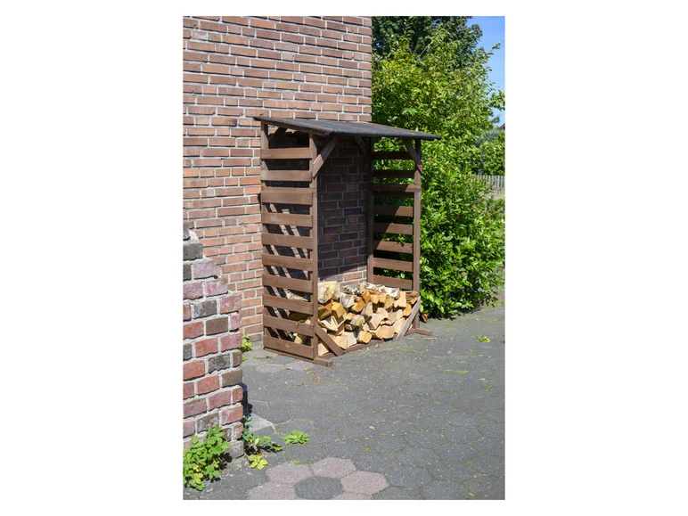 Il possède des parois latérales ouvertes qui favorisent la ventilation du bois afin qu'il sèche mieux. Le toit en bitume gris imperméable avec un grand débord de toit protège également le bois de chauffage des précipitations et grâce au toit en pente, l'eau de pluie s'écoule vers l'avant. De plus, les profilés de base et les barres transversales assurent une bonne stabilité.