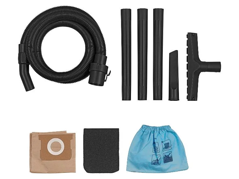 | Accessoires: | 1x tuyau d'aspiration (2 m) 1x suceur plat 1x brosse pour sols 1x tube d'aspiration 3 pièces 1x sac filtre papier 1x sac filtre textile (lavable) 1x filtre en mousse (pour l'aspiration humide) |