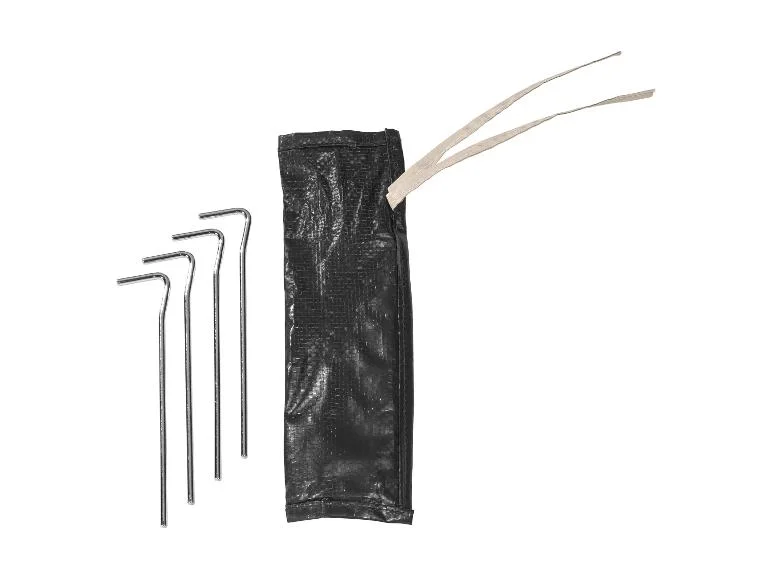 - Accessoires inclus : 4 cordes de tension (prémontées, longueur variable), 4 piquets, 3 sangles de fixation avec fermeture à clic