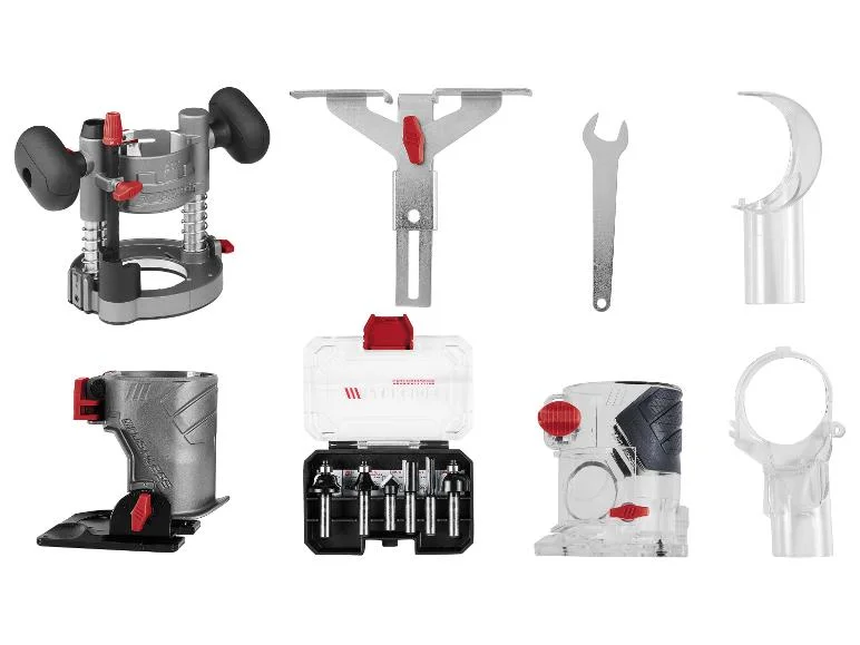 | Accessoires | 2x embouts d'aspiration 1x butée parallèle 1x outil de montage 3x modules de fraisage 1x jeu de 6 fraises (1x fraise à arrondir Ø 22 mm, 1x fraise à rainure concave Ø 22 mm, 2x fraises à rainurer Ø 6 mm et Ø 12 mm, 1x fraise à rainure en V Ø 12,7 mm, 1x fraise à profil Ø 25 mm) |