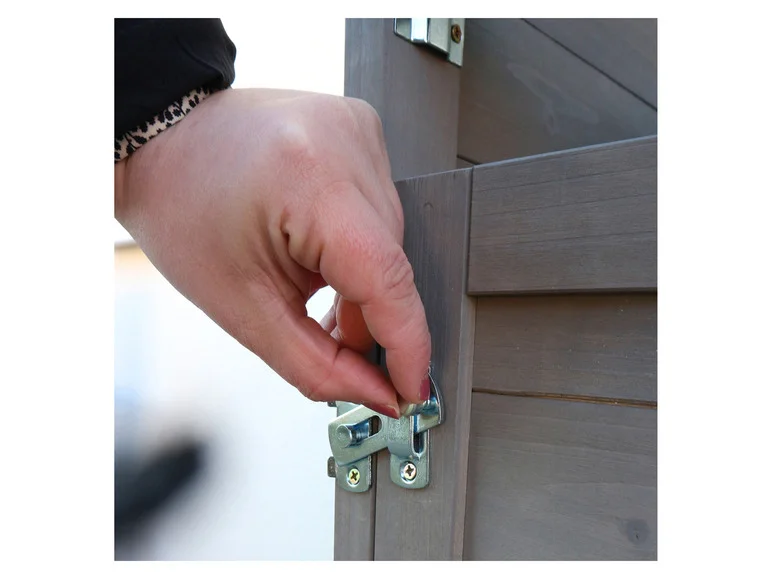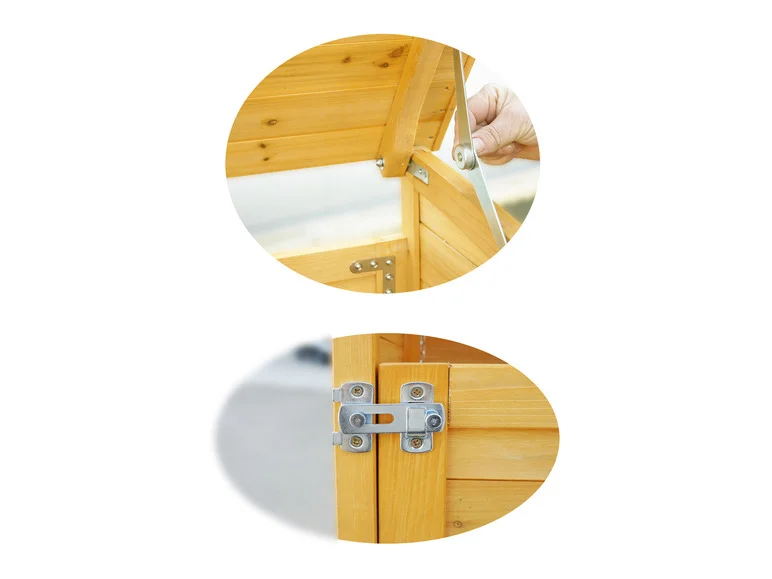 • Le toit galvanisé résistant aux intempéries permet à l’eau de pluie de s’écouler sans pénétrer dans le bois