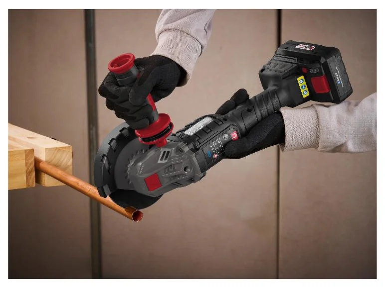 - Kit de démarrage comprenant batterie, chargeur, disque à tronçonner en métal pré-monté, poignée supplémentaire et clé de serrage