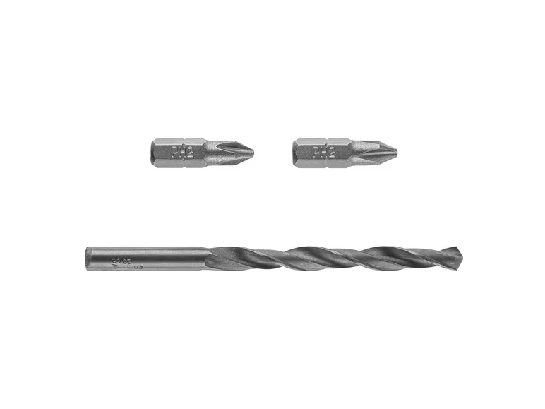 Accessoires inclus : 2 embouts de vissage (L 25 mm), 1 foret (Ø 6 mm)
