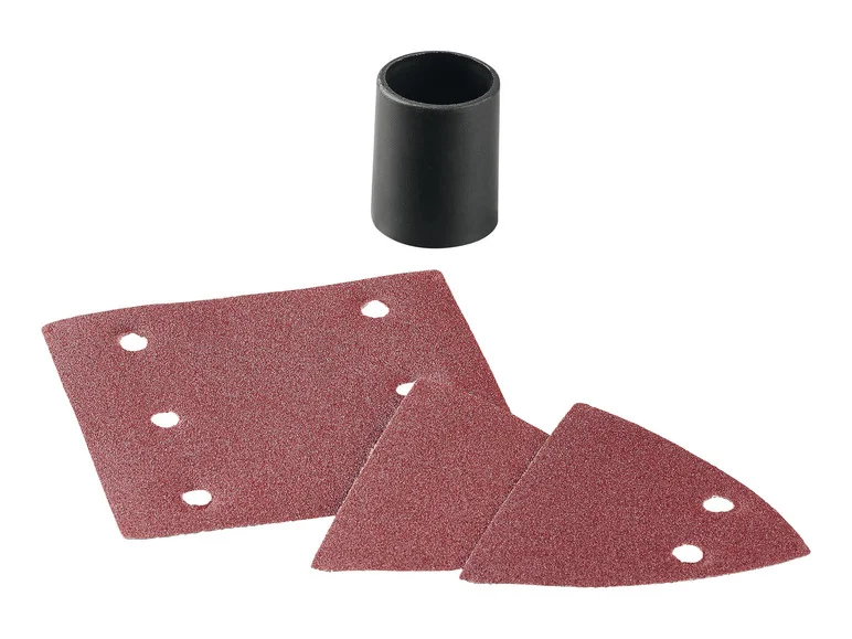 Accessoires inclus : 2 feuilles abrasives triangulaires (120), 1 feuille abrasive rectangulaire (120), 1 adaptateur pour système d’aspiration externe