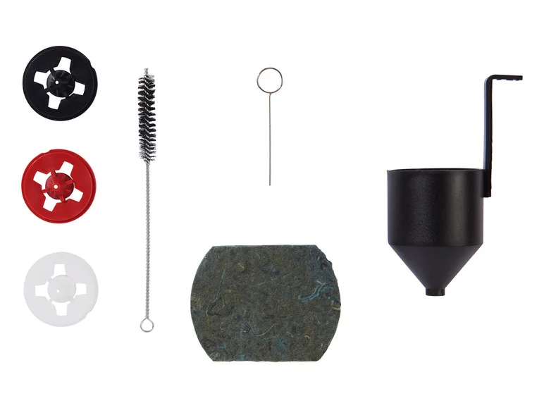 - Accessoires inclus : 4 x buses (Ø 1,5 / 1,8 / 2,2 / 2,6 mm - une buse prémontée), 1 x godet de mesure de la viscosité, 1 x brosse de nettoyage, 1 x aiguille de nettoyage, 1 x filtre à air de rechange