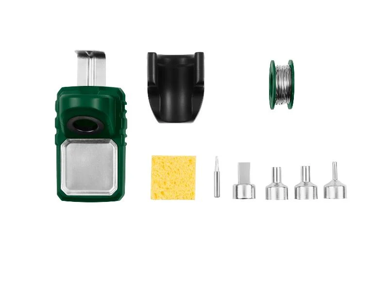 | Accessoires : | 4 accessoires pour souffleurs d'air chaud, 2 pannes à souder (1 panne - pré-assemblée, 1 panne plate), 40 g de soudure (Ø 1,2 mm), 1 support en plastique, 1 support en métal avec plateau en métal, 1 éponge de nettoyage |