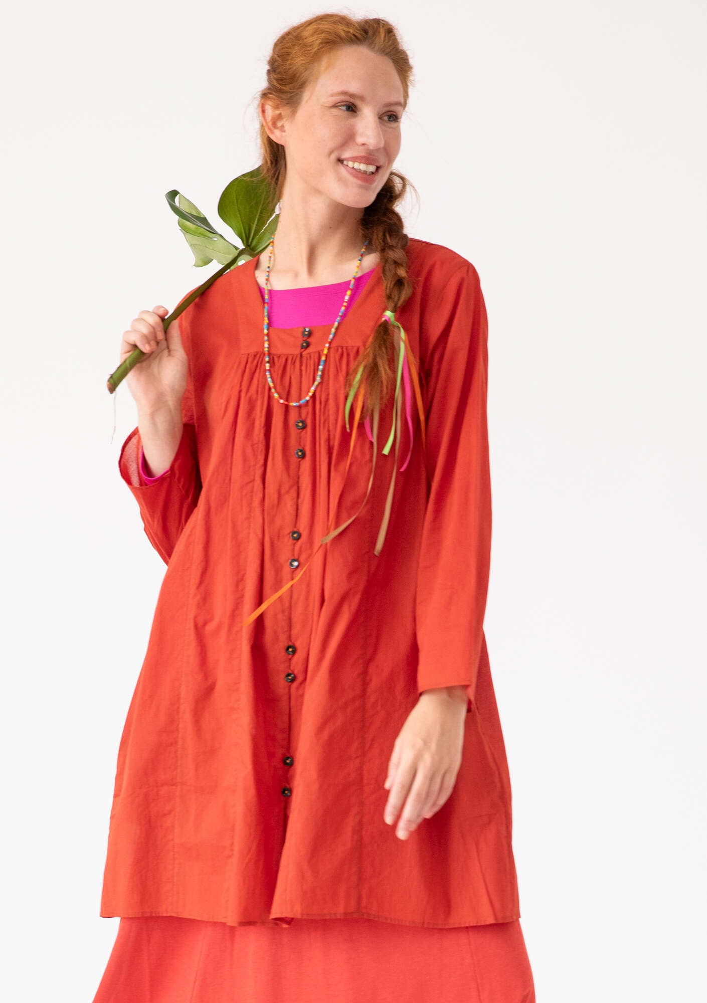 • Full-length sleeves and flattering volume. Button-through style and attractive neckline. The front features inset panels with two different patterns. Also available in solid colours.