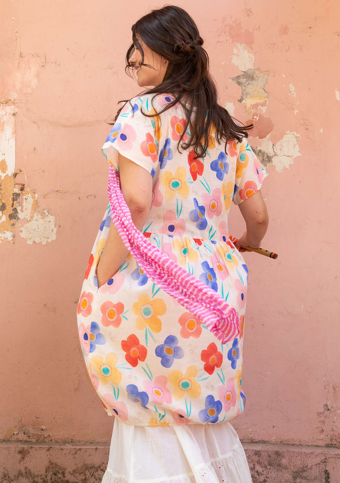 100% cotton. The cotton is certified organic. The print is certified as compliant with environmental standards. Delicate wash at 40°. Iron on medium heat. 2-3% shrinkage. Made in Faridabad, India.