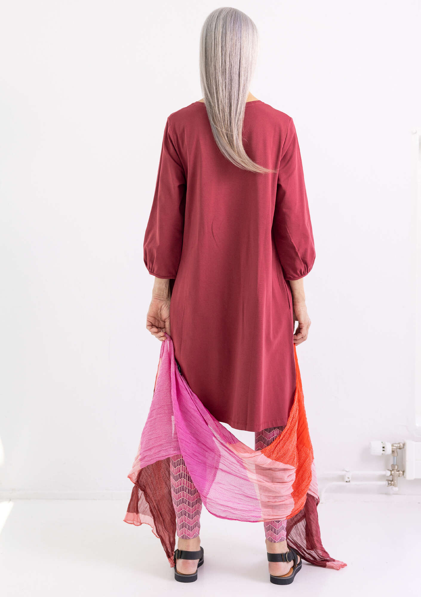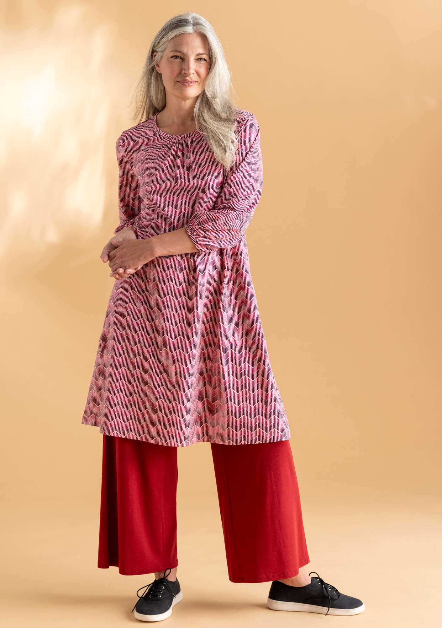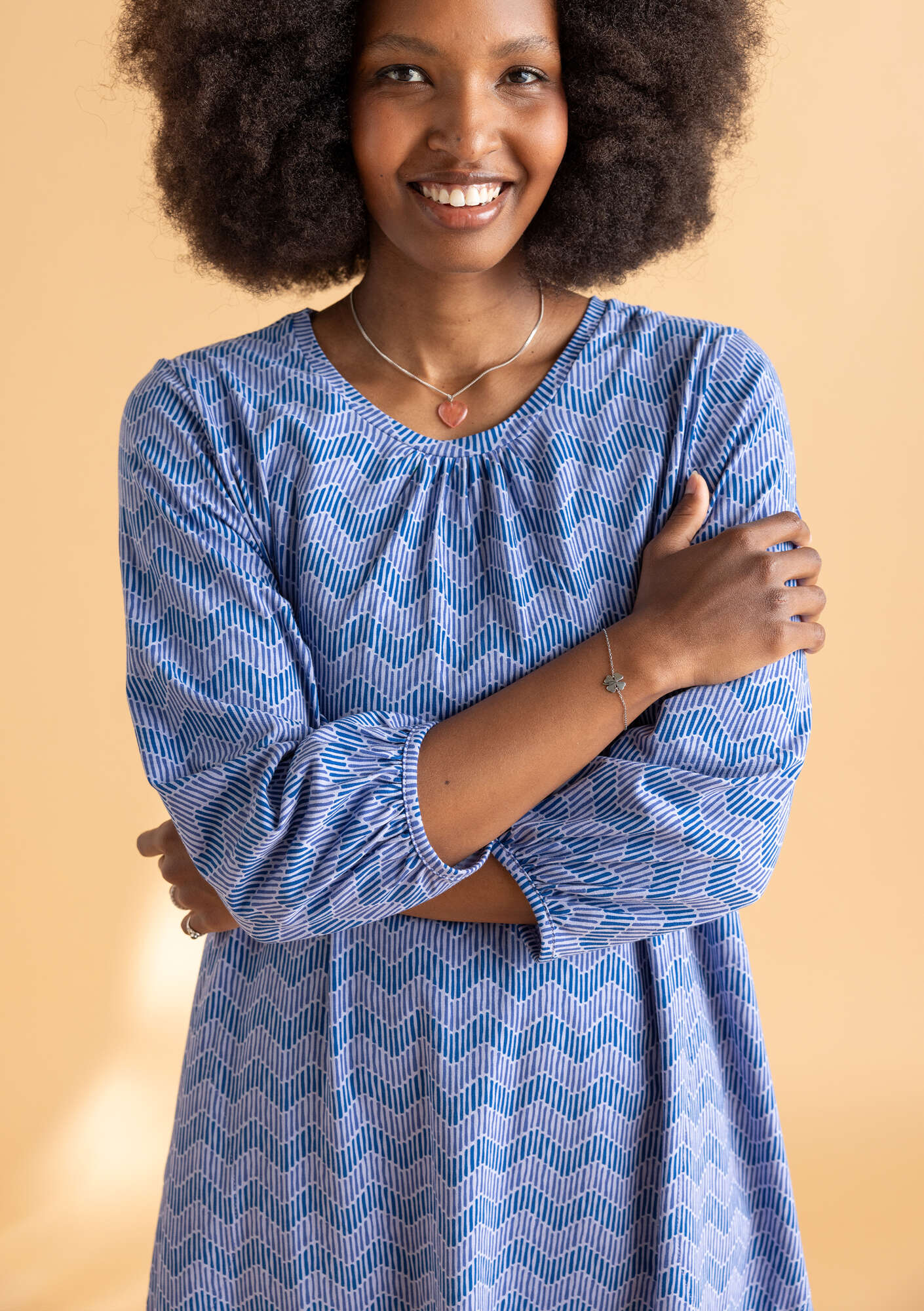 Simple silhouette with three-quarter sleeves. Soft gathers at the cuffs and front of the neck create a flattering fit. Available in solid colour and print options. Side pockets.