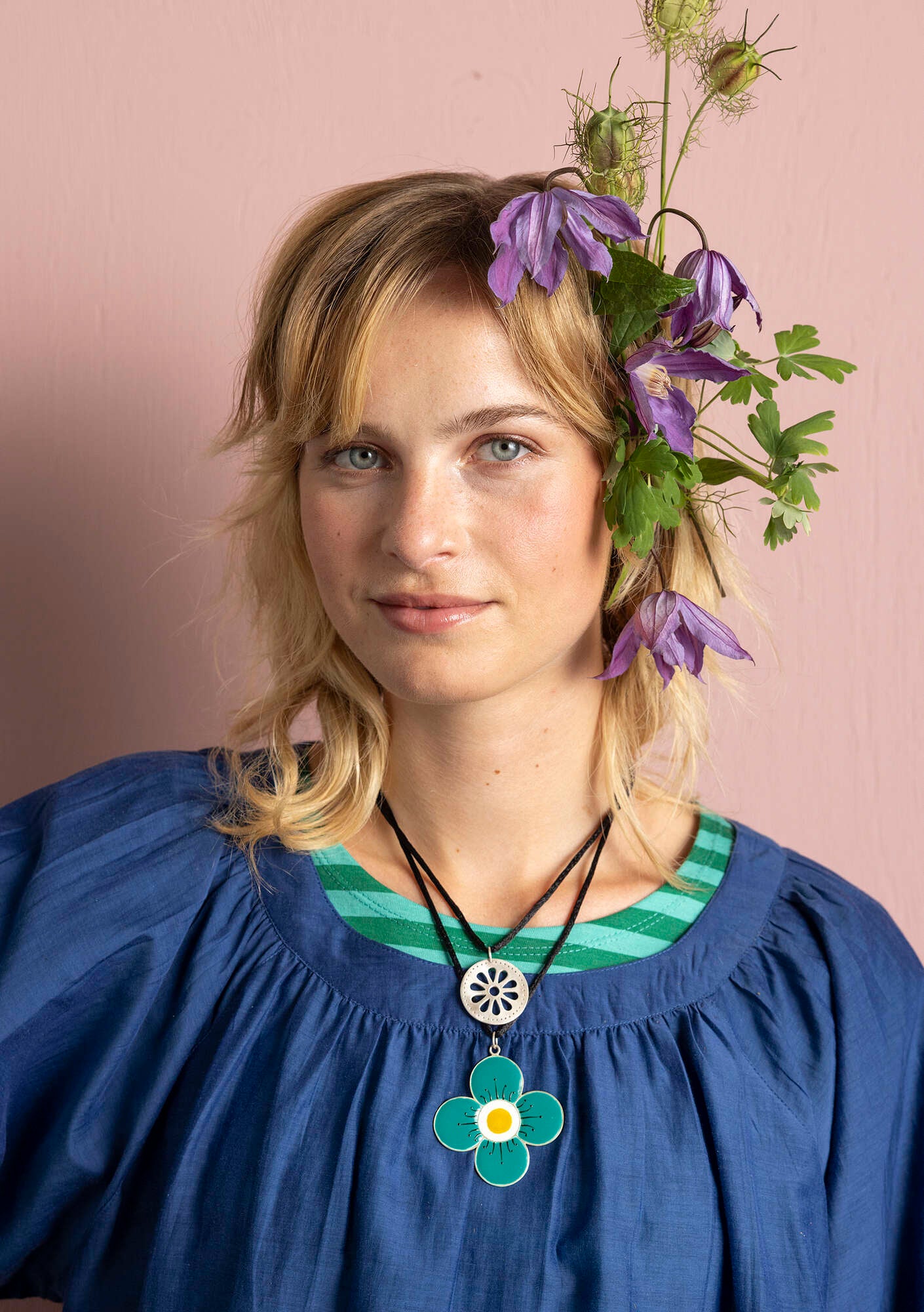 Exclusive necklace with a charming, round openwork flower pendant in 925 sterling silver. 62-cm-long cord with a silver clasp. Comes in a small cloth bag.