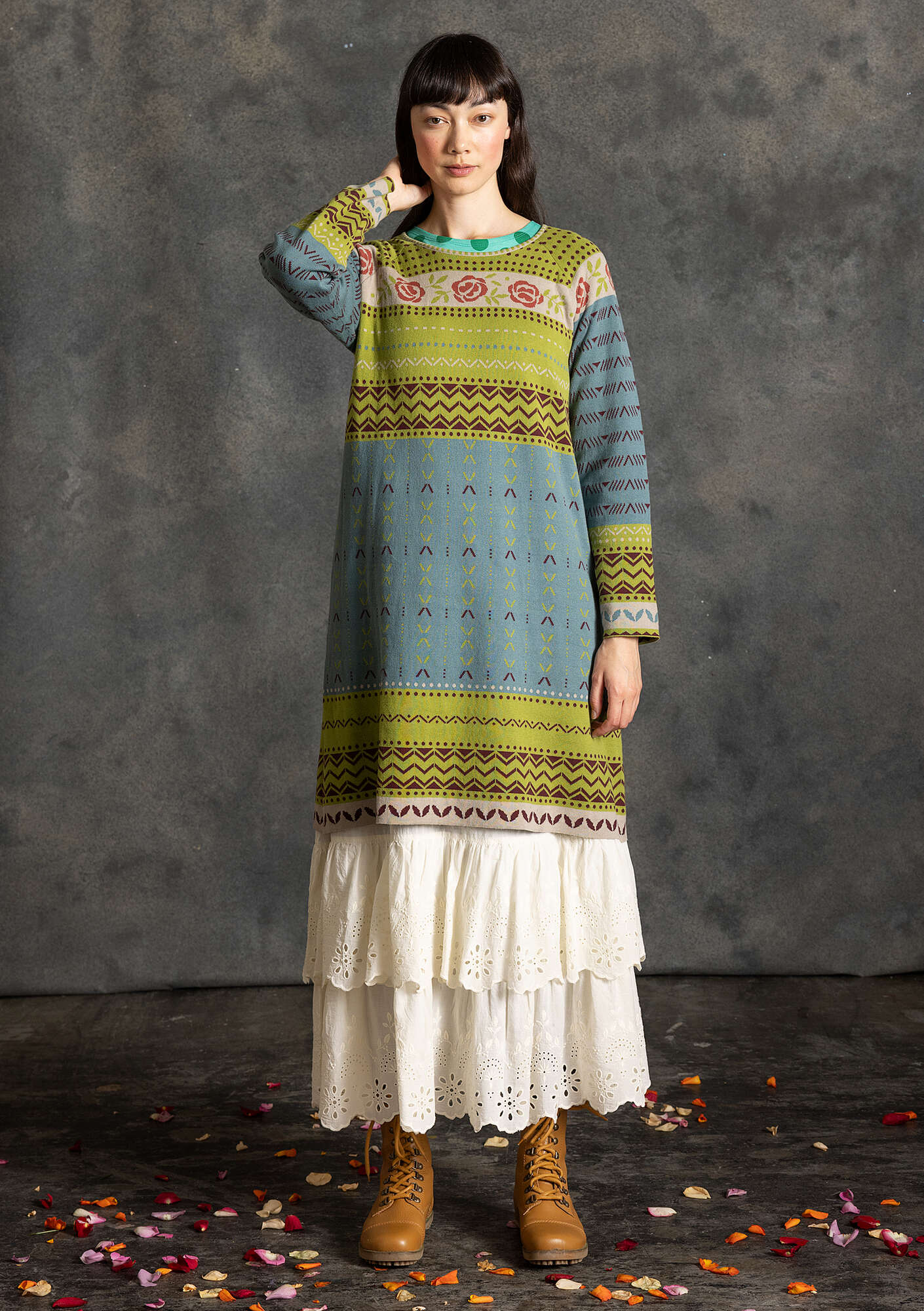 Jacquard-knit dress with full-length sleeves, a round neckline and lovely width in the skirt. Finely crafted with a rose placement design around the neck and over the shoulders.