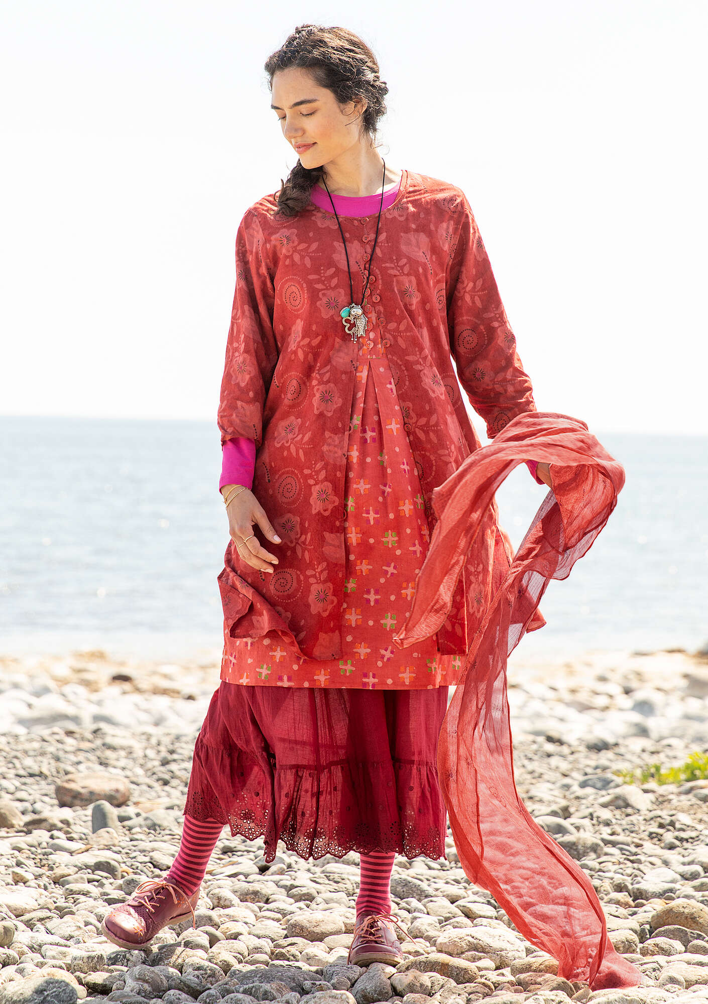 The pattern on this button-through dress has been block printed with a mud resist technique and dyed with plant materials. A round neckline, extra long three-quarter sleeves and fabric-covered buttons. Inset pockets and slits at the sides. We think the front opening lining in a different pattern is a charming detail.