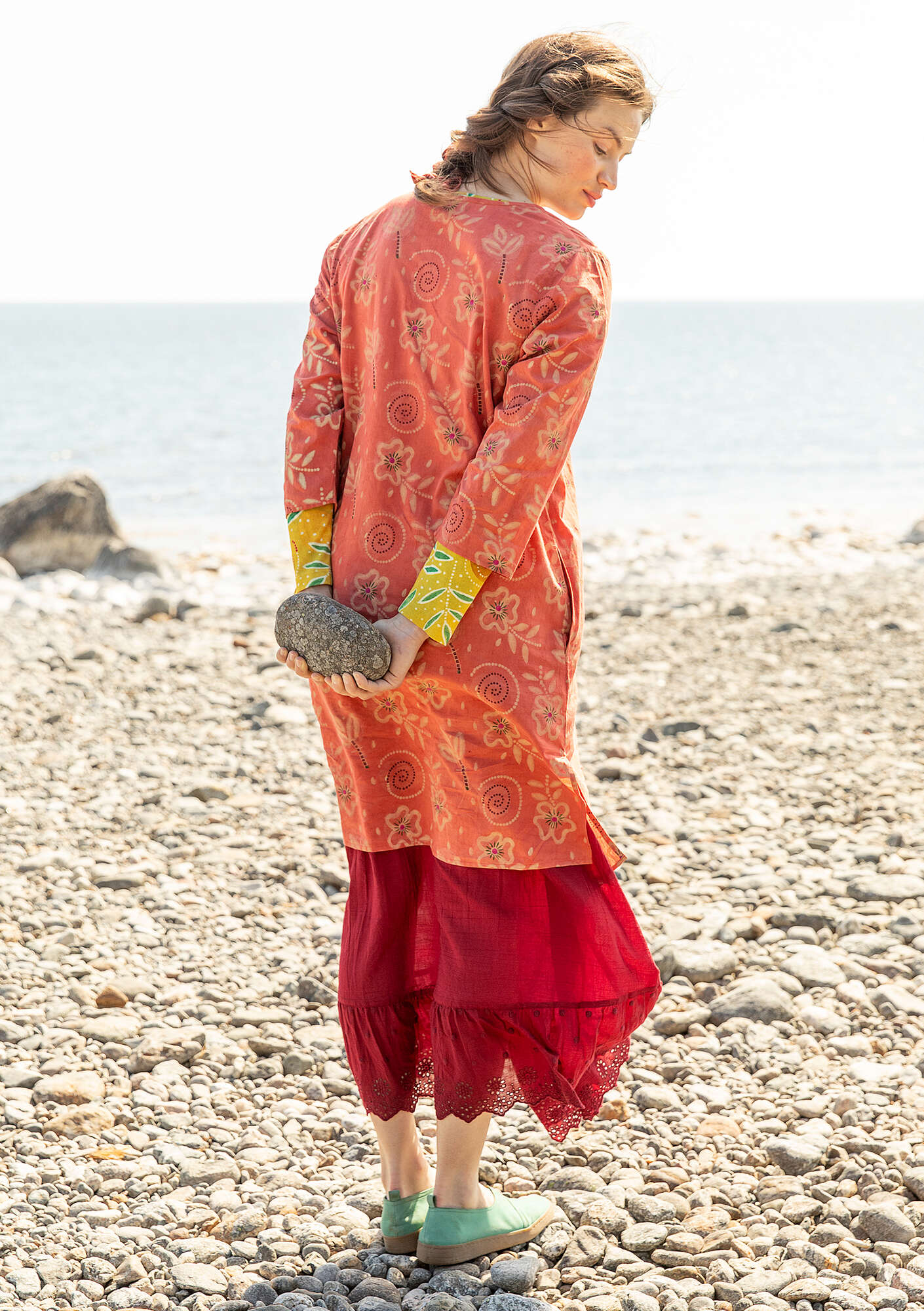 100% cotton. The cotton is certified organic. The garment is hand block printed using a mud resist technique and dyed with plant materials. The dyes used are myrobalan for Kashish, madder for Henna and indigo and pomegranate peel for Hopper. Do not soak. Avoid exposure to strong sunlight which causes plant-dyed textiles to fade more easily. Delicate wash at 30°. Use a gentle detergent. Wash separately. Iron on medium heat. 2-3% shrinkage. Made in Bagru, India.
