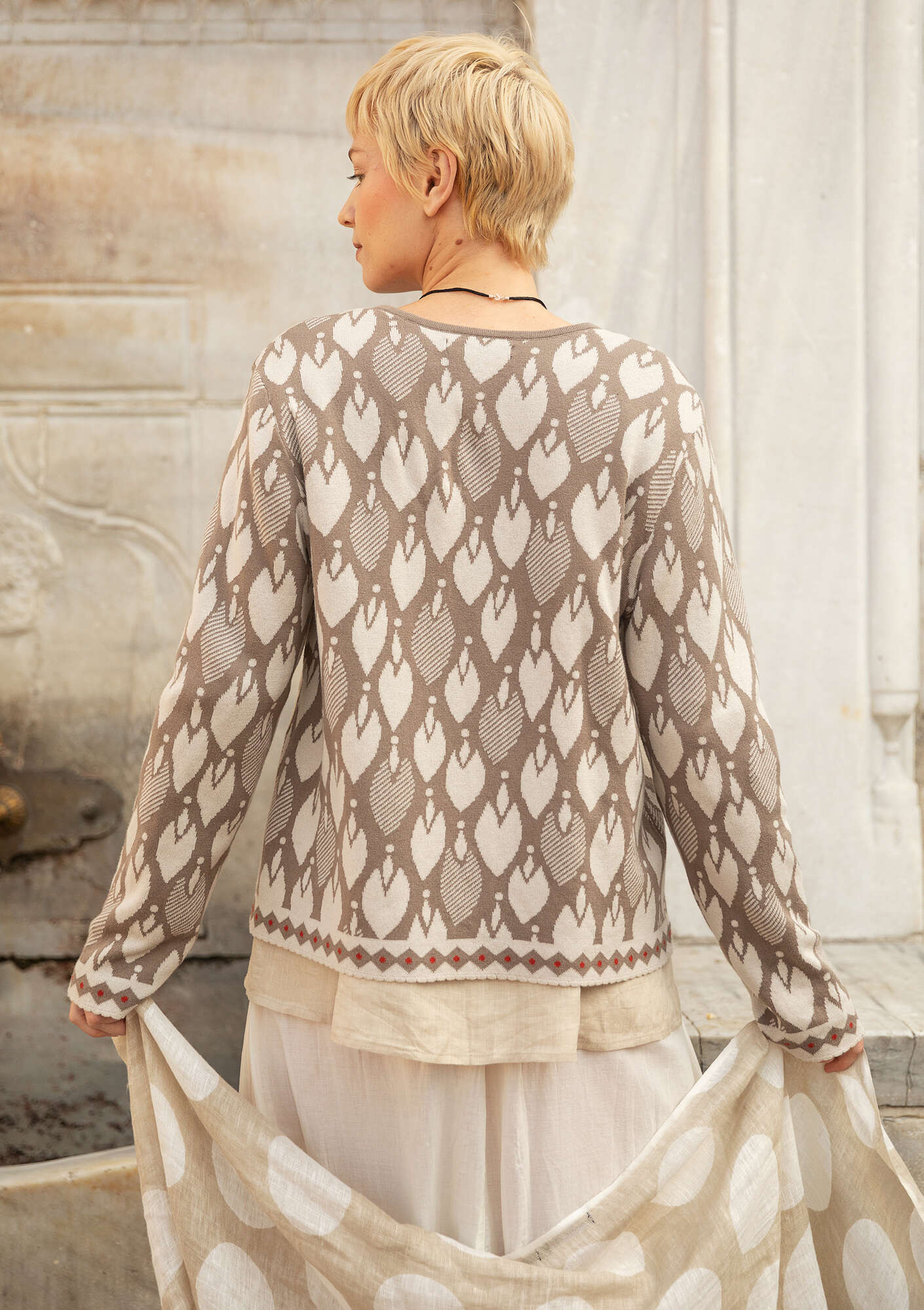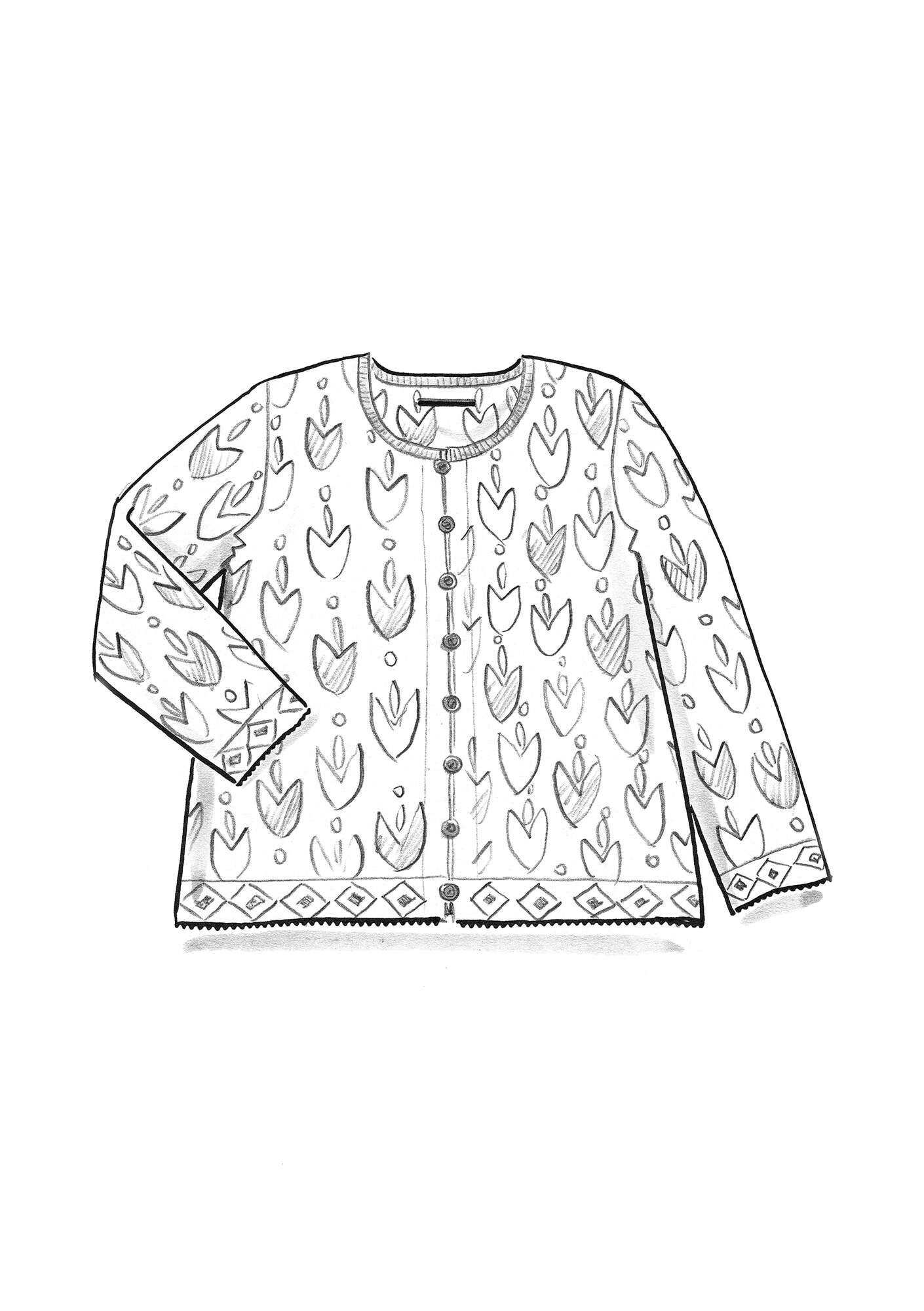 • Double-faced jacquard cardigan with full-length sleeves and a scoop neckline. The scalloped hem and cuffs add a decorative touch. Coconut shell button closure.