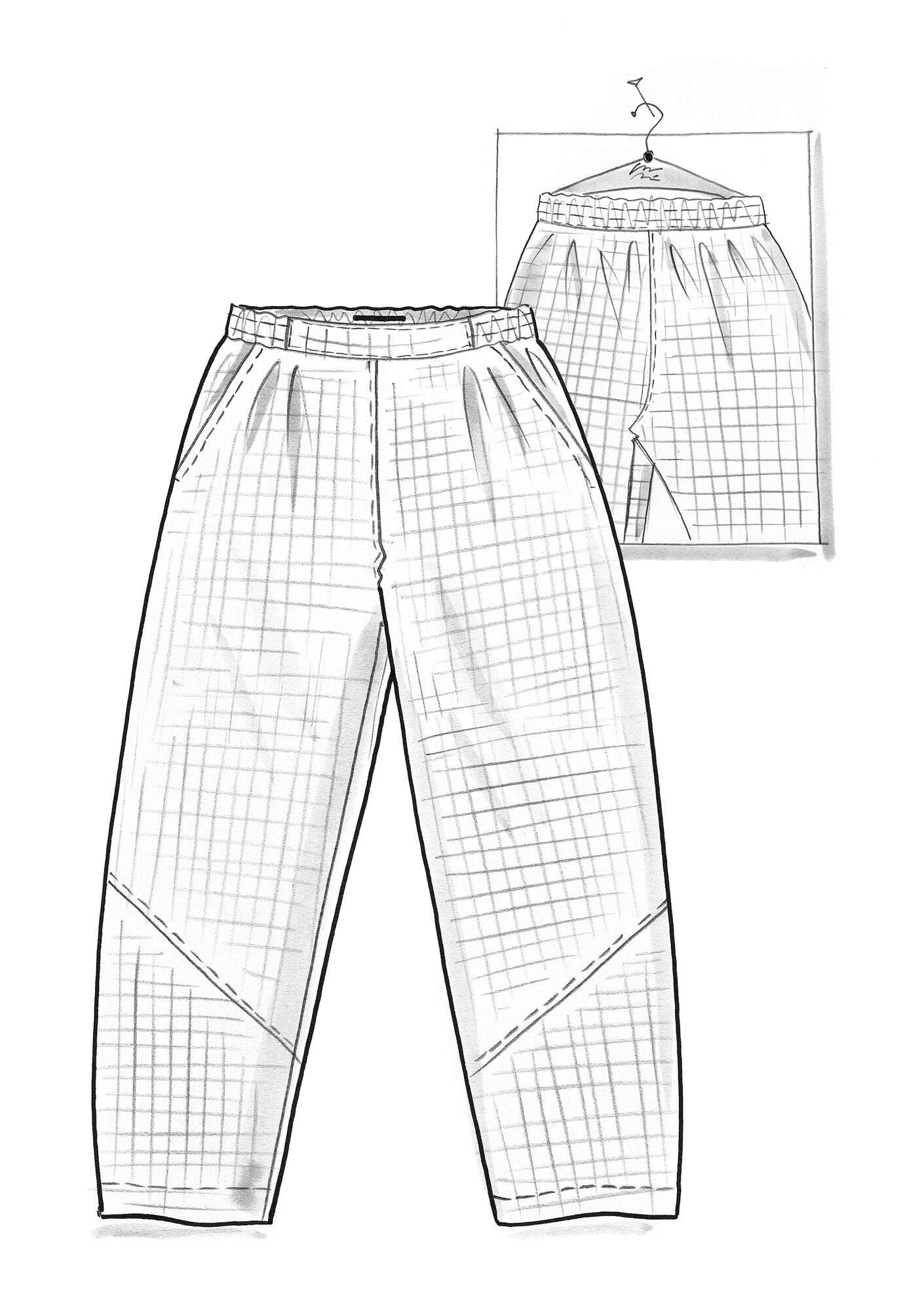 • Cut from comfortable cotton twill printed with a neat check pattern inspired by cobblestones. Ankle-length trousers with an elasticated back and side waistband. Two front box pleats and side pockets. The lower leg is stylishly shaped by the attractive diagonal stitching.