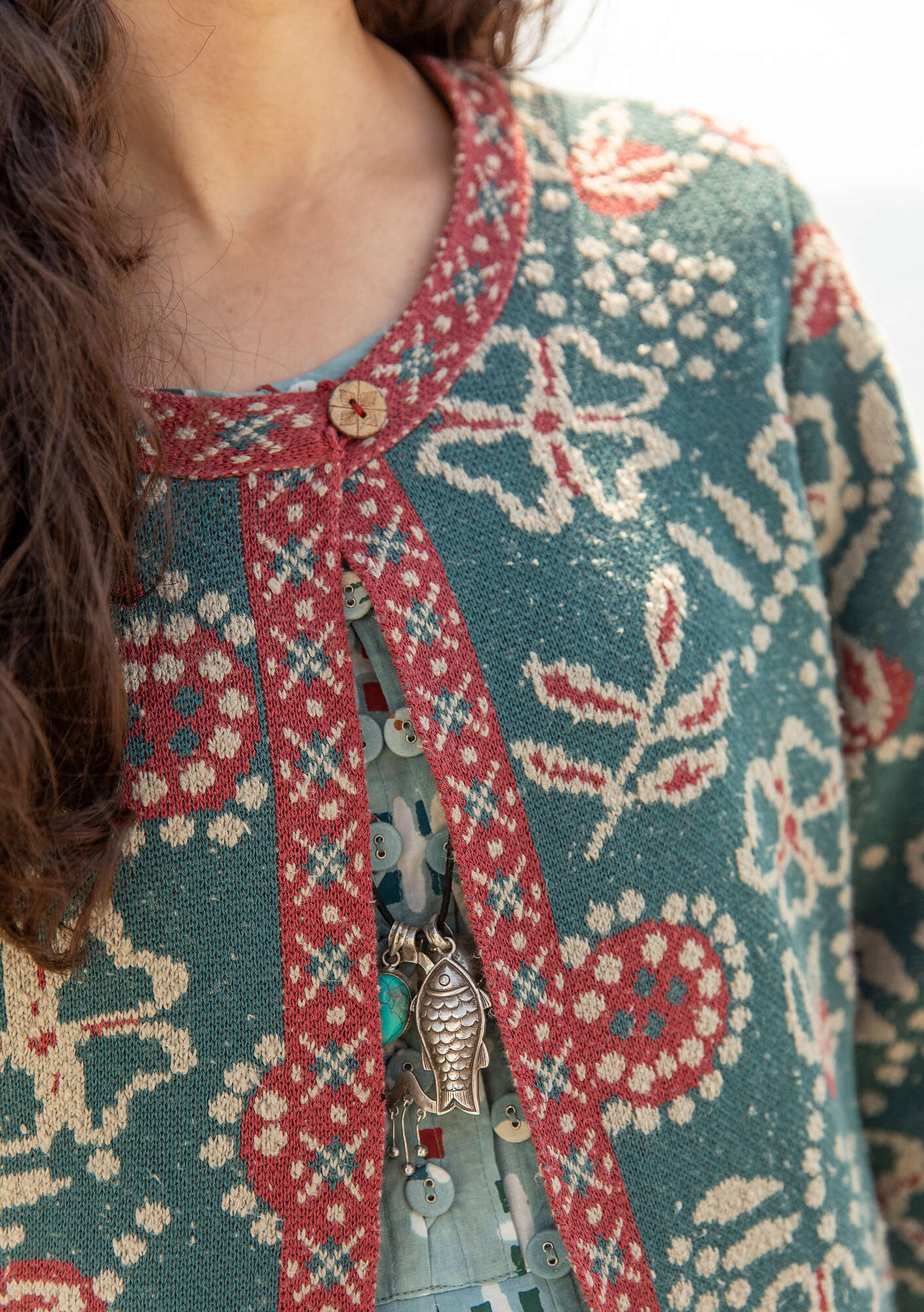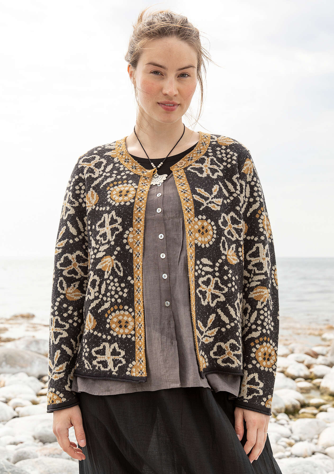 Must-have cardigan with a jacquard-knit pattern in a slub yarn. Decorative borders run along the neck and down the front opening. The hem and cuffs are finished with dainty rolled edges. The front fastens with a single wooden button. Full-length sleeves.