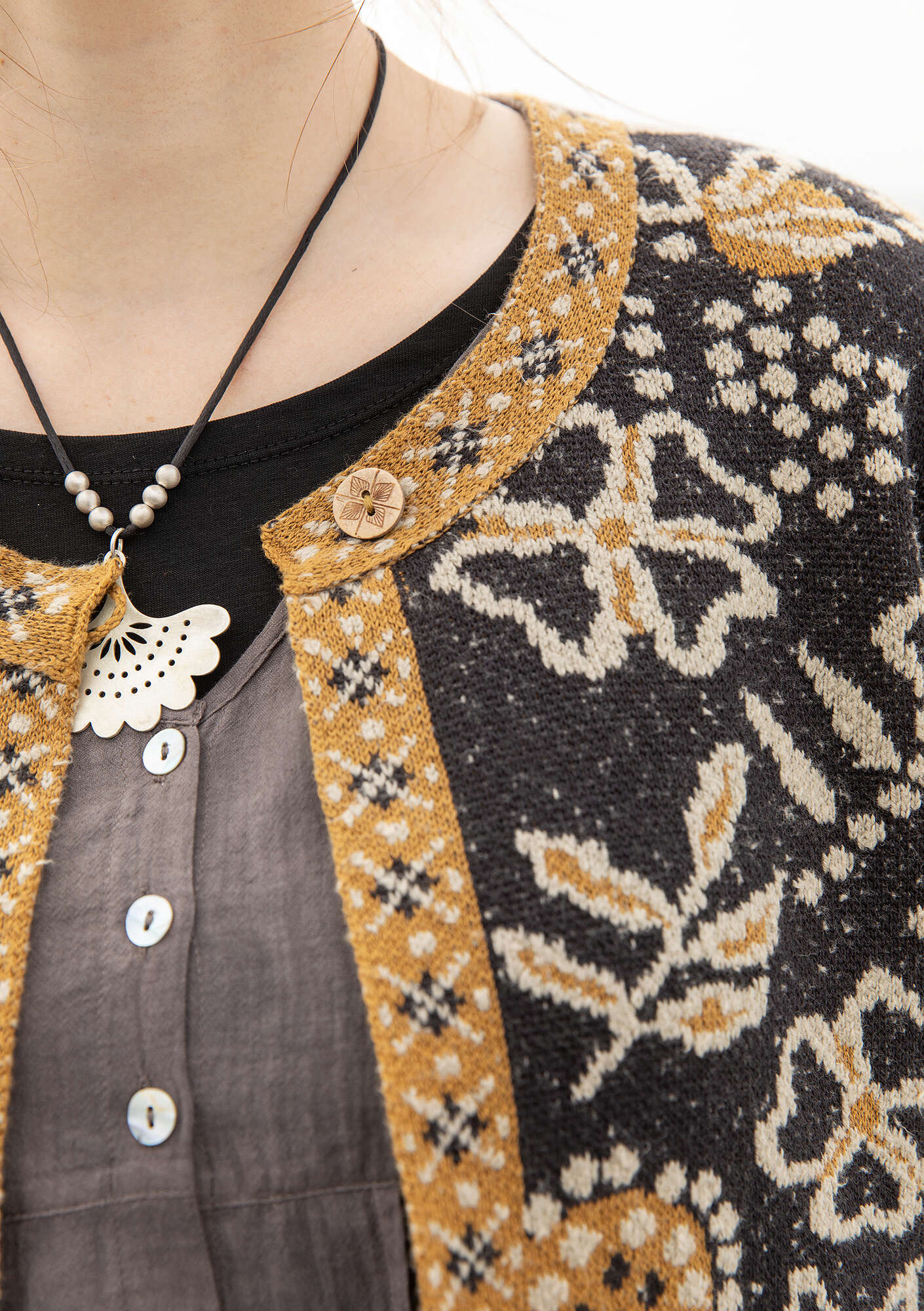 Must-have cardigan with a jacquard-knit pattern in a slub yarn. Decorative borders run along the neck and down the front opening. The hem and cuffs are finished with dainty rolled edges. The front fastens with a single wooden button. Full-length sleeves.